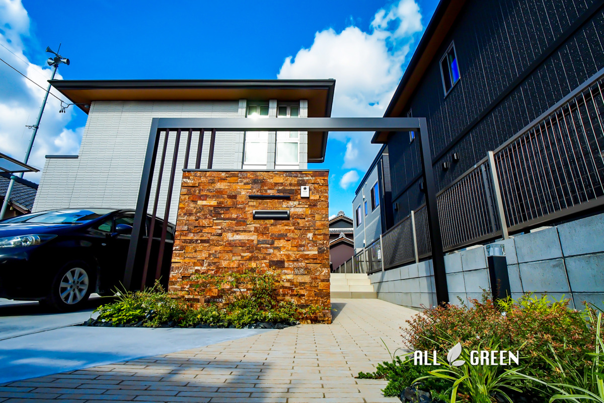 門柱とゲートフレームのふもとには、割栗石から植栽の下草が顔を出しておりナチュラルさがより醸し出されています。割栗石は、大きさ・形・色が様々であり洋風と和風のどちらの雰囲気の空間で使用しても大活躍してくれます。付近には照明も設置されているので夜間にライトアップされることで、立体感が演出されて陰影がくっきりするため明るい昼間とはまた違ったモダンなカッコいい表情を見ることができるのではないでしょうか。
