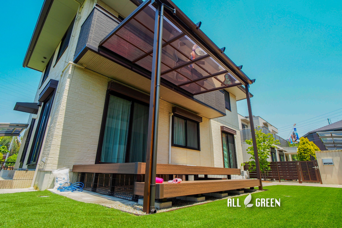 テラス屋根、ウッドデッキ、フェンス、門扉、物置