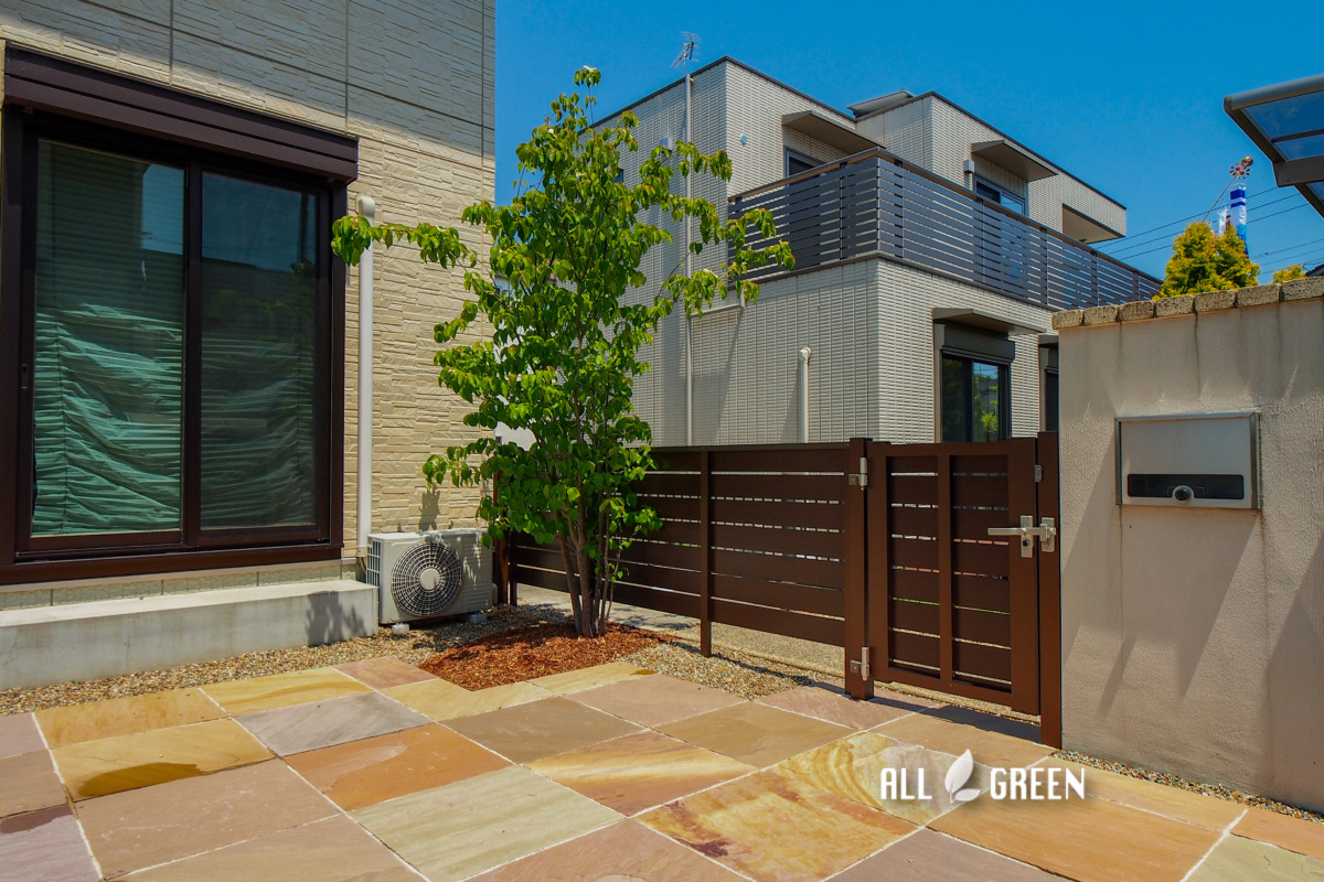 門塀横にもワンちゃんが外に飛び出してしまわぬよう、門扉とフェンスを施工し家族時間はもちろん愛犬もニッコリ笑顔が溢れる素敵なお庭に生まれ変わりました。