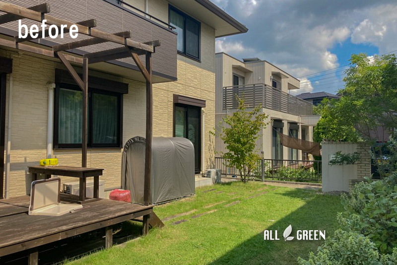 新築時に設置した天然木でできたパーゴラとウッドデッキが経年劣化してしまったこととお庭に敷いている天然芝のお手入れが大変ということから、スッキリとした綺麗なお庭にリフォームしたいというご相談をいただきました。