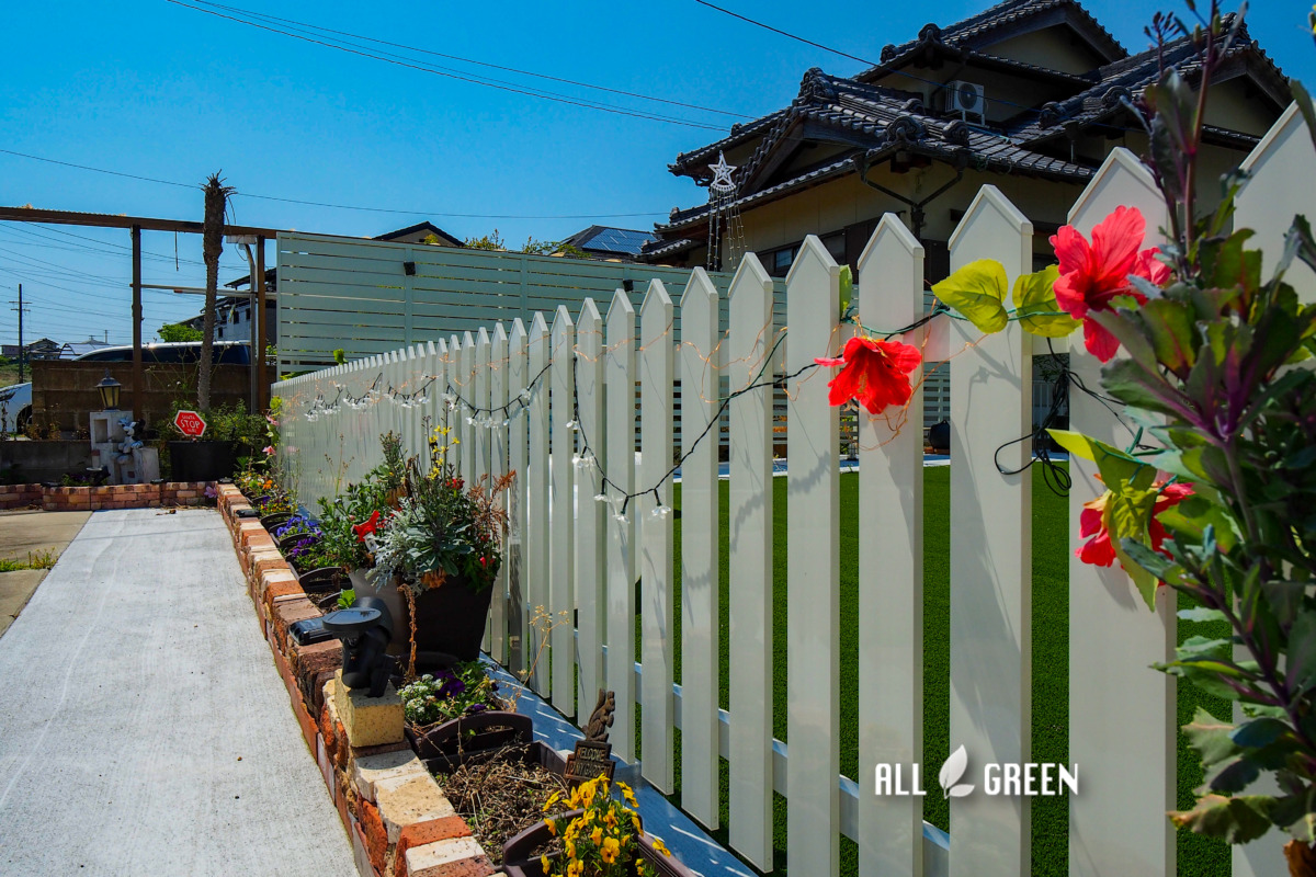 こちらも撤去前に設置されていたフェンスと同じ白色のものを使用し、リフォーム前の景観を崩さず、人工芝や植物が映える空間に。