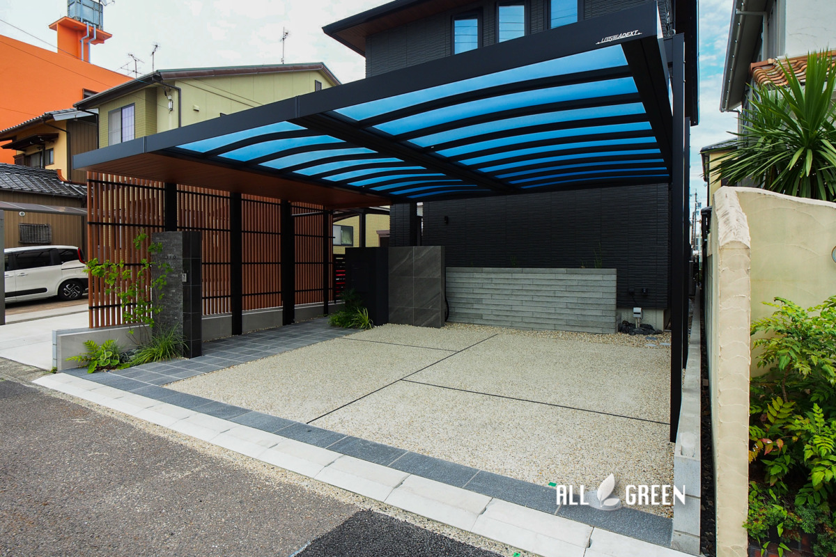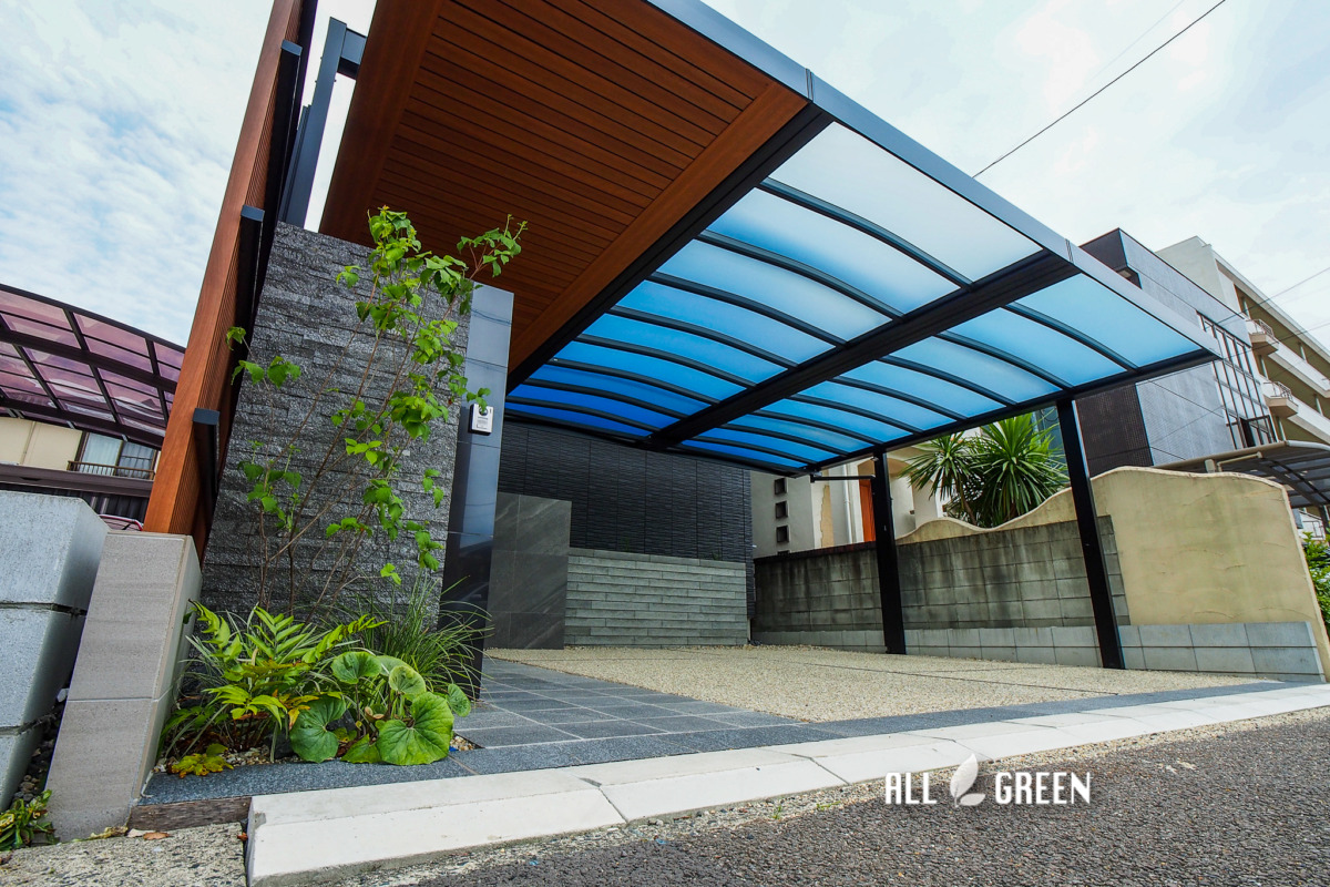 設置されたカーポートは三協アルミのUスタイルアゼスト。アプローチ上部にあたる屋根材に、木目の天井材を使用することで来客へのおもてなし心を意識しています。駐車空間には熱線遮断のポリカボネートを屋根材として使用しており、車に対して優しい設計となっています。