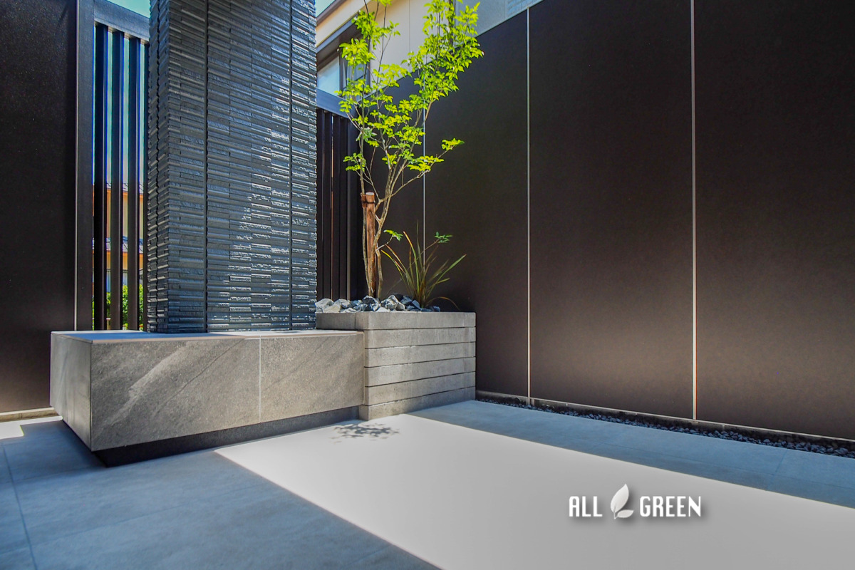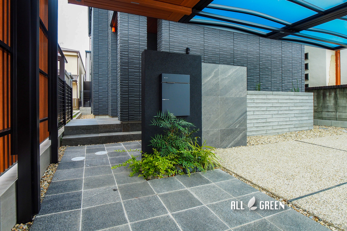 駐車場、カーポート、アプローチ、門塀、宅配ボックス、表札、タイルテラス、坪庭、花壇、ベンチ、目隠し塀、縦格子スクリーン、目隠しフェンス