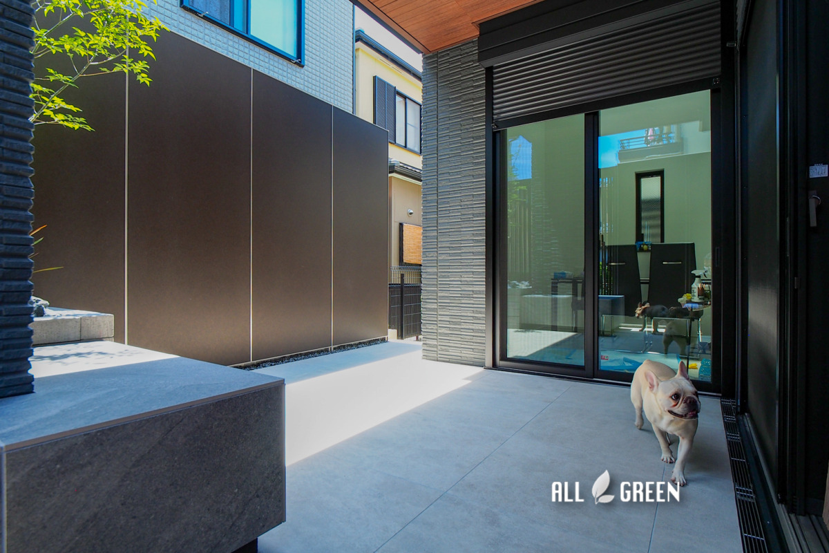 玄関ポーチと同じ300角のタイルや600×300角の長方形タイルを使用し施工されることも多いタイルテラスですが、600角の大判タイルを使用し施工することでダイナミックかつ高級感のある空間を演出することができました。