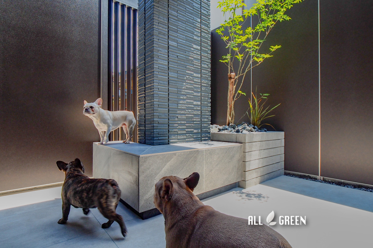とてもかわいい3匹のフレンチブルドッグちゃんたちが、完成した外構を案内してくれているお写真と共にこだわりのデザインをご紹介していきます。
