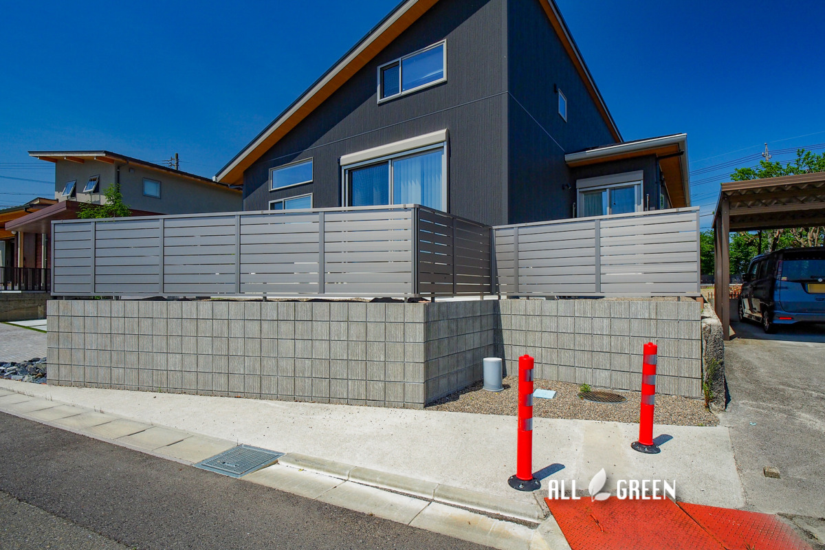 | 外構工事概要 | 三重県員弁郡G様邸新築外構 駐車場、カーポート、駐輪場、サイクルポート、門塀、階段、アプローチ、フェンス、目隠しフェンス、物置、立水栓、人工芝、照明、植栽 |
