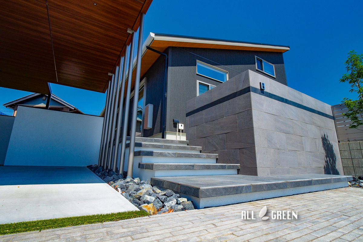 カーポート横、邸宅を囲うような形で施工されたL字の門塀は、薄いグレーのタイルを基調にデザイン。チャコールカラーのタイルをアクセントとしてあしらいモダンな雰囲気に仕上げています。