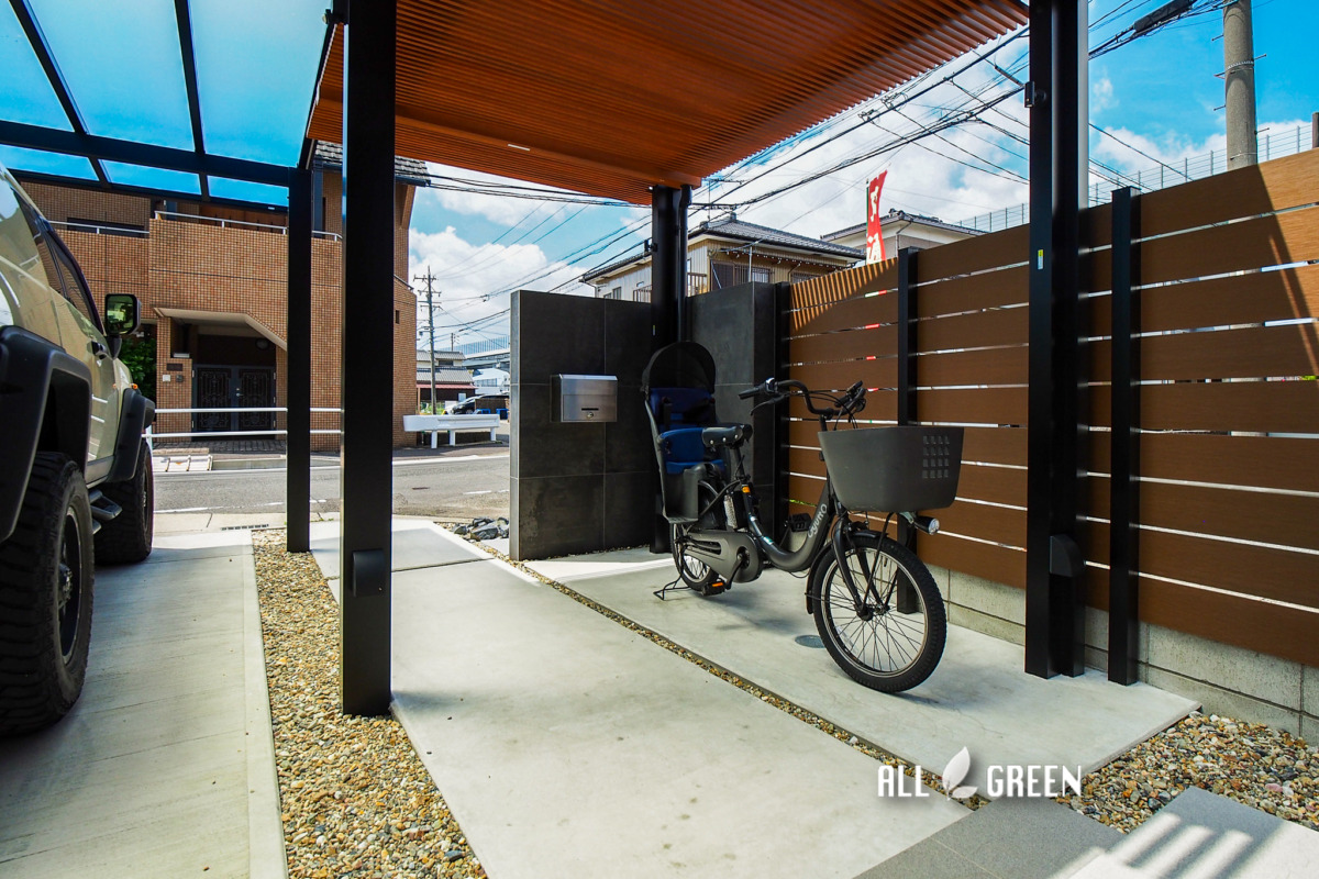 横に併設されたルーフは、アプローチの屋根として、そして駐輪スペースの屋根として活躍しています。