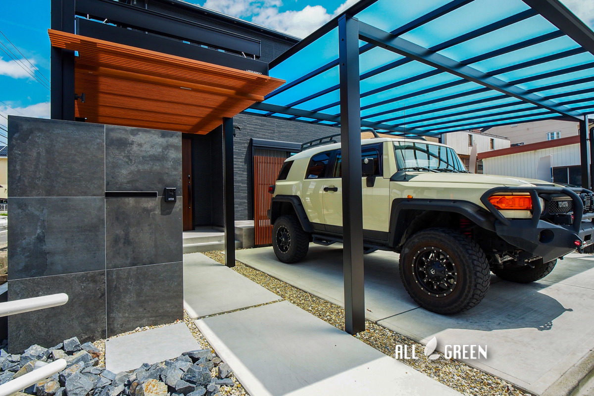 大きくてかっこいい車と黒を基調とした建物にぴったりの素敵な外構ですね!