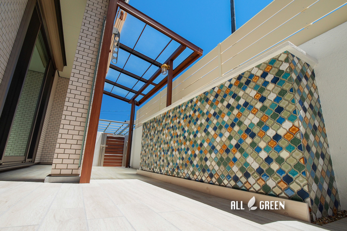 一番のアクセントであるモザイクタイルを使用した花壇は同じデザインのものを施工しています。