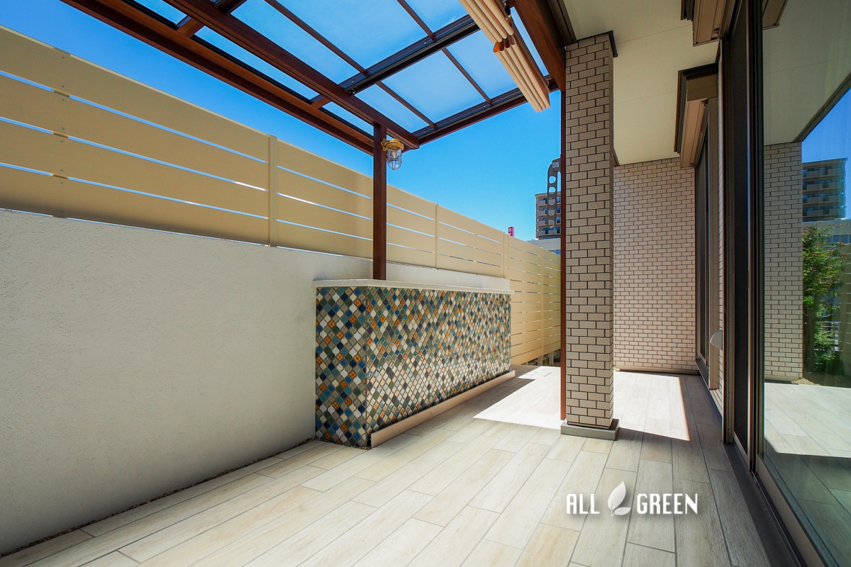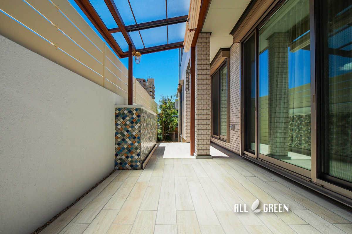 邸宅1階の掃き出し窓から出てすぐにあるお庭に新設されたタイルデッキは、木目柄のタイルを使用し、タイルデッキでありながらウッドデッキのようなナチュラルさや温かみを空間全体で感じられるようデザインいたしました。