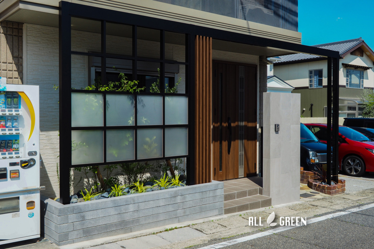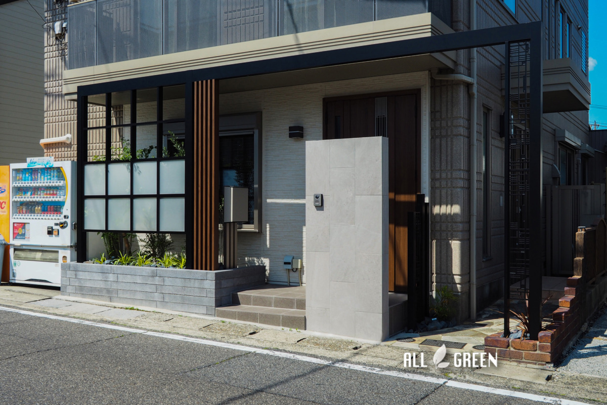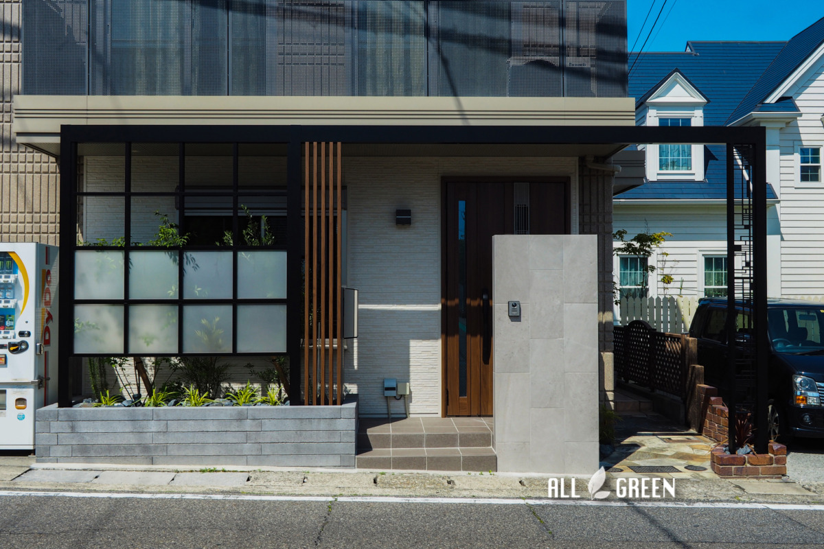 今回は目の前にある道路から目隠しもしたいというご要望も頂いていたため、ゲートとして施工したLIXLのGフレームにGスクリーンを組み合わせ目隠し効果もファサードゲートに加えています。