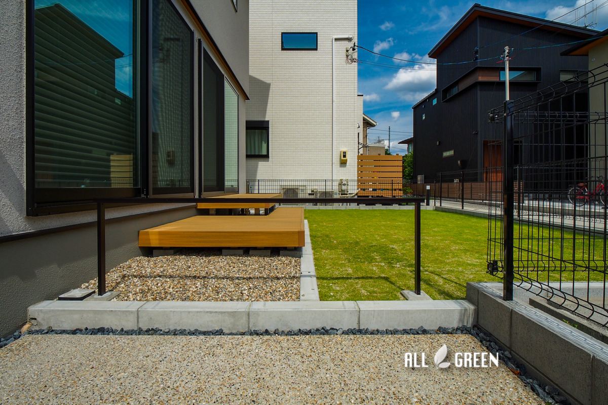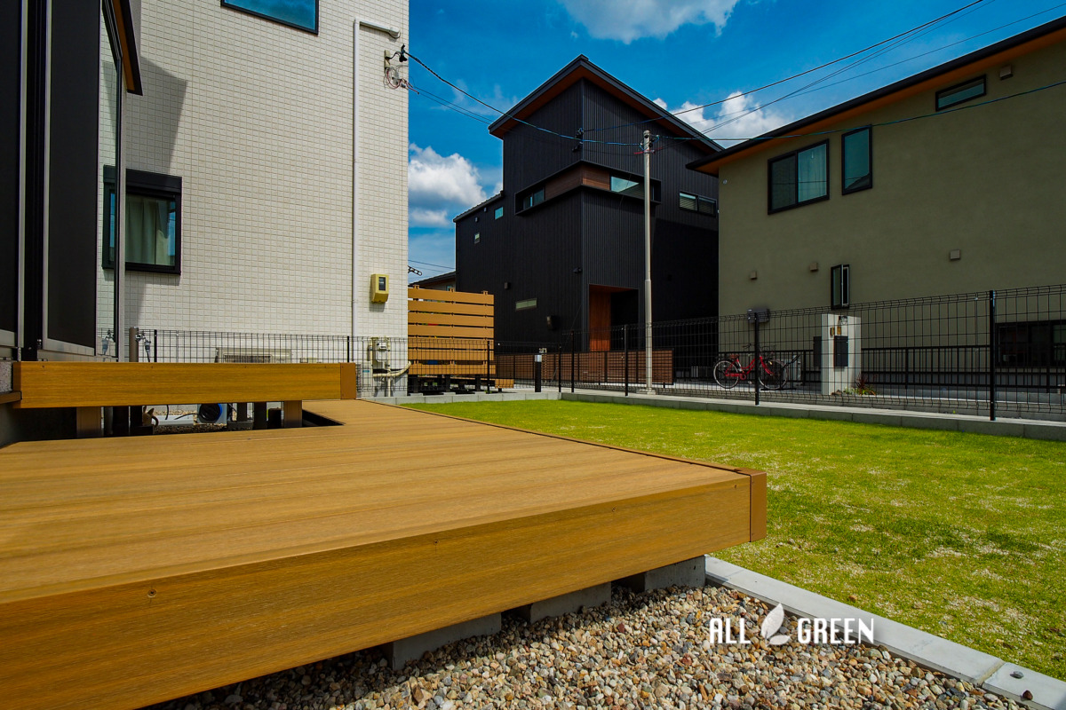 | エクステリア商品 | 駐車場:洗出しコンクリート スリット/単粒砕石 手摺:LIXIL アーキレール ベース柱 カバーあり 横桟1段 (ブラック) フェンス:LIXIL ハイグリッドフェンス UF型8型 T-10 T-8(ブラック) ウッドデッキ:四国化成 ファンデッキHG 標準柱 2段(オーク) ウッドデッキ下:防草シート+砂利敷き 花壇:山砂敷き均し 見切りレンガ:ミルドブリック60(ミルベージュ) 芝:高麗芝 植栽:アオダモ H2.5 下草+割栗石 照明:タカショー ガーデンアップライトミオ 2.7W |