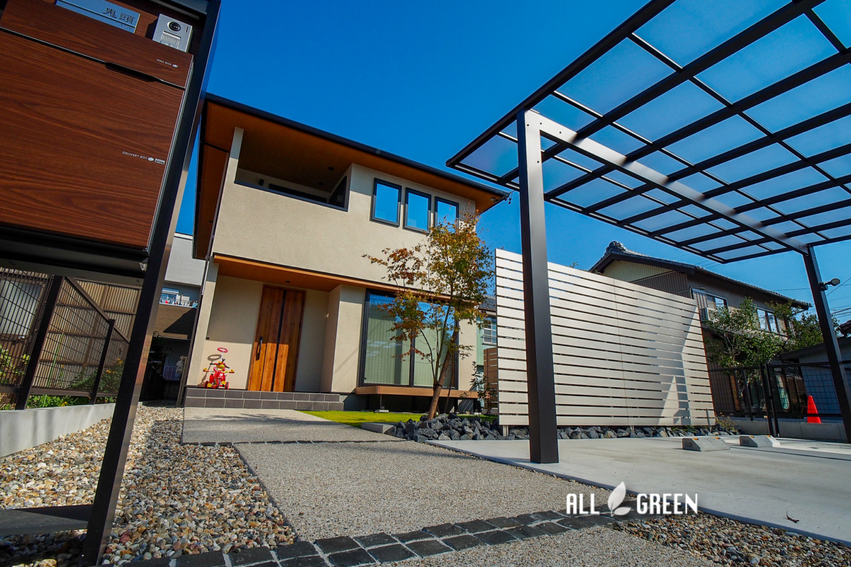ご家族と邸宅のように温かみのある外構をデザインさせて頂きました。