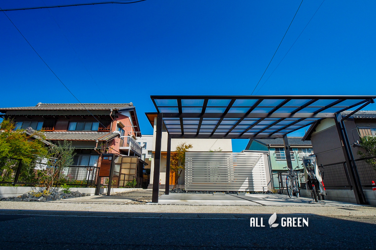 邸宅を正面にみて、大きく構えるカーポートはフラットなフォルムのものをご希望されておりましたので、YKKapのエフルージュツインFIRSTをご提案。