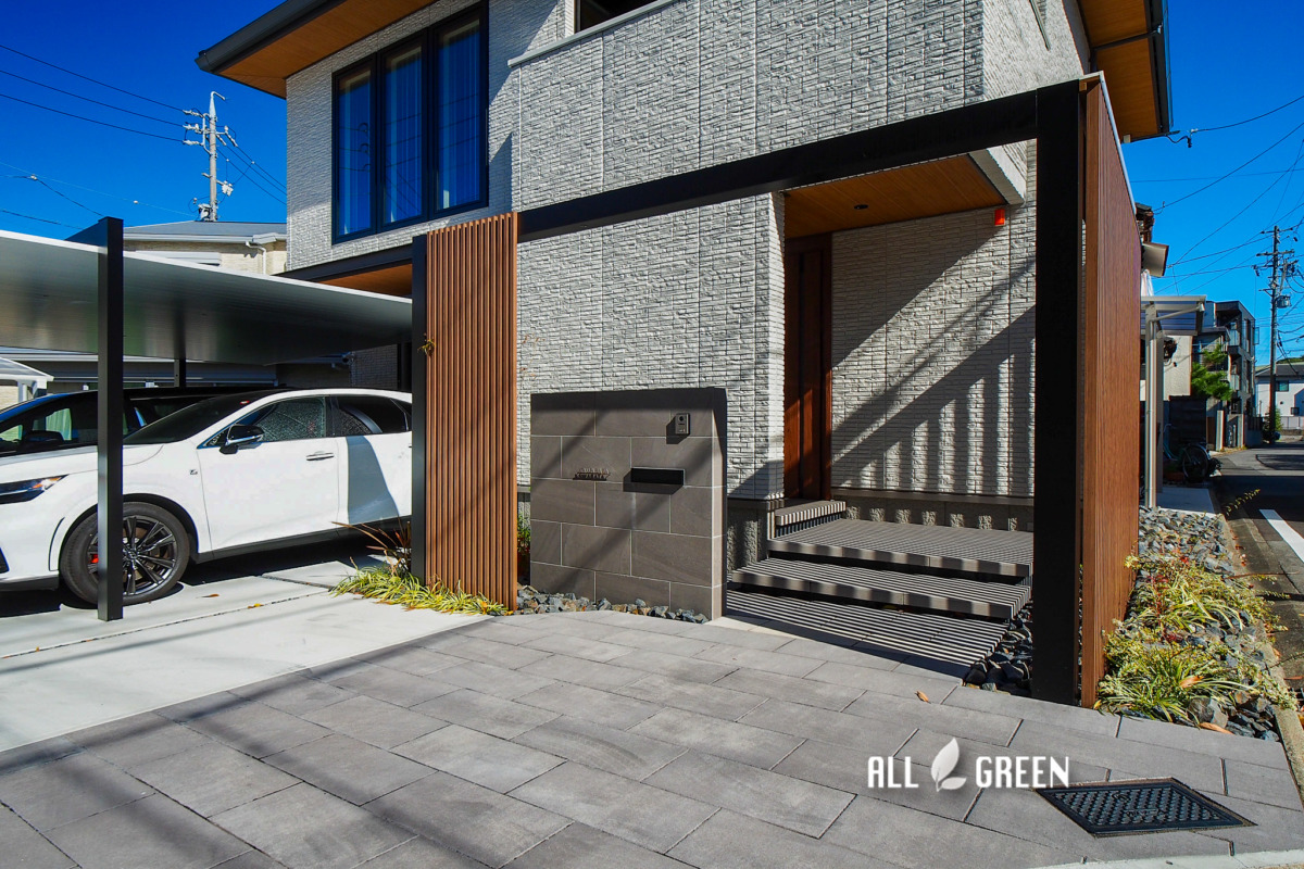 駐車場の土間コンクリートと色味やデザイン性でメリハリをつけることで華やかさのあるモダンなアプローチになりました。