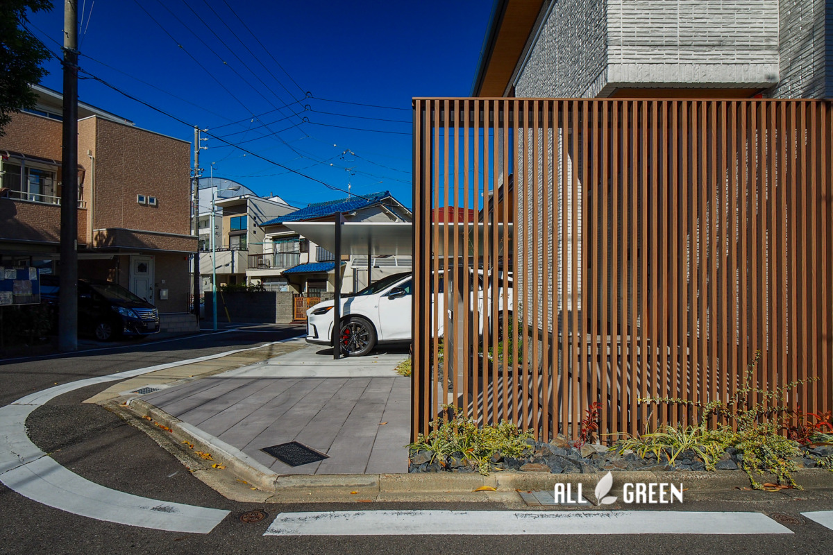 門塀を囲うように取り付けられたファサードゲートは、正面とサイドに木目の縦格子を組み合わせています。