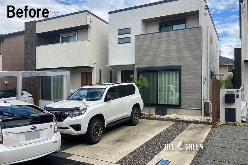 写真を撮った時間や日時が違うので空の色も多少関係してくるかもしれませんが、筆者ビフォーアフターの写真を見比べたとき駐車スペースもリフォームしたのかな?土間や洗い出しも打ち直したのかな?って思っていたんですけど、実際駐車スペースは既存のままでなにもしていないらしく・・・!空間がぱぁーっと明るくなったことで空間全体に目新しさを与えてくれたのかもしれません(*’ω’*)