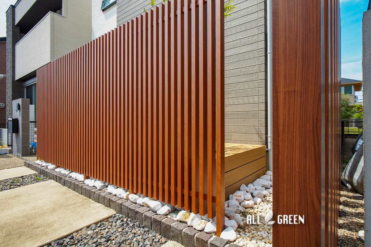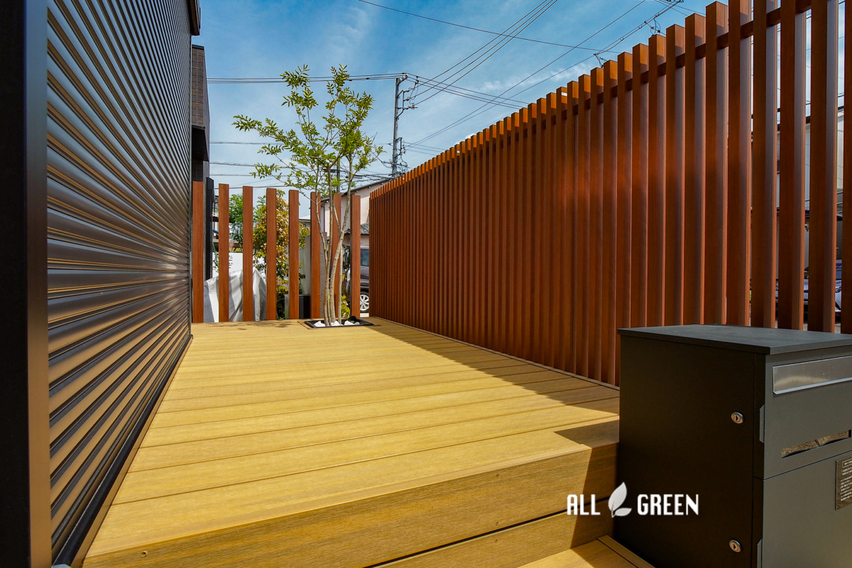 こちらはお子様がデッキで遊ぶ様子を正面に広がる道路から見えてしまわないよう施工に至ったものですが、あえて高さのある縦格子を設置することでお子様だけでなくお施主様がデッキ上に立っていても見えないようになっています。