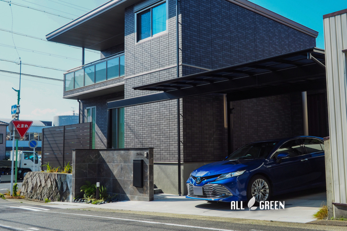 門塀に使用されたツヤのあるタイルと梁延長されたカーポートのバランスがマッチ!