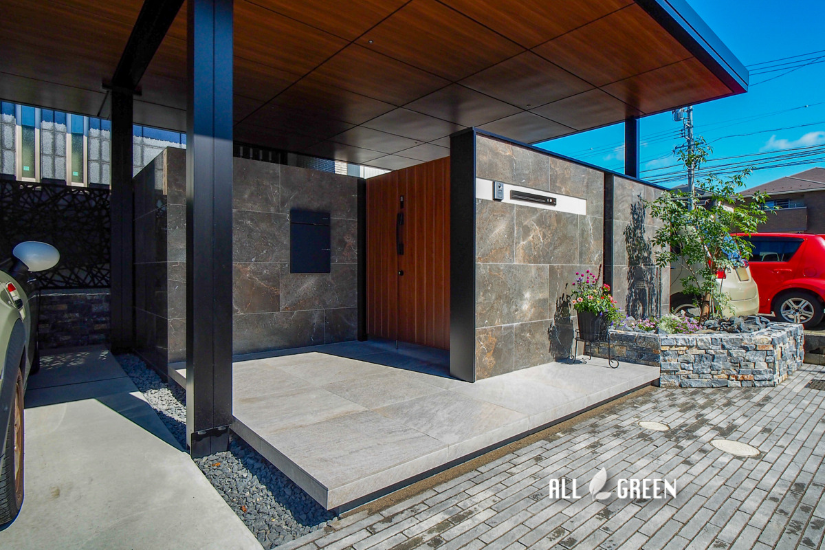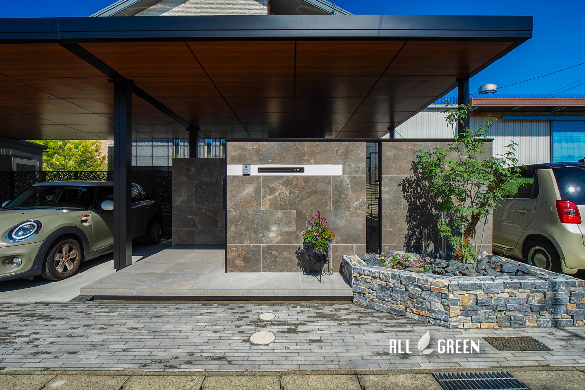 カーポートが天井材付きで重厚感たっぷりのものに、門塀は塗りの白い壁から落ち着いたモダンカラーのタイルが貼られた仕様に・・・