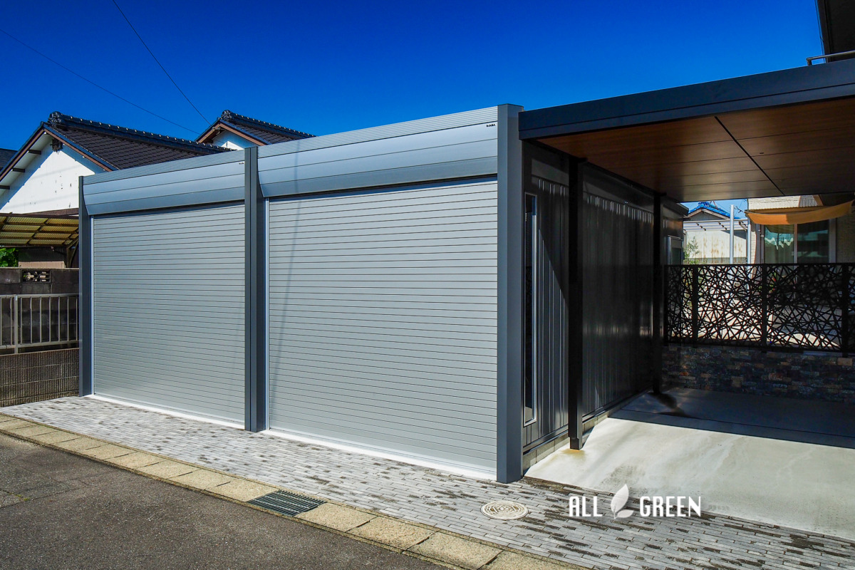 正面から見て、駐車スペース左横には2棟のガレージを施工。