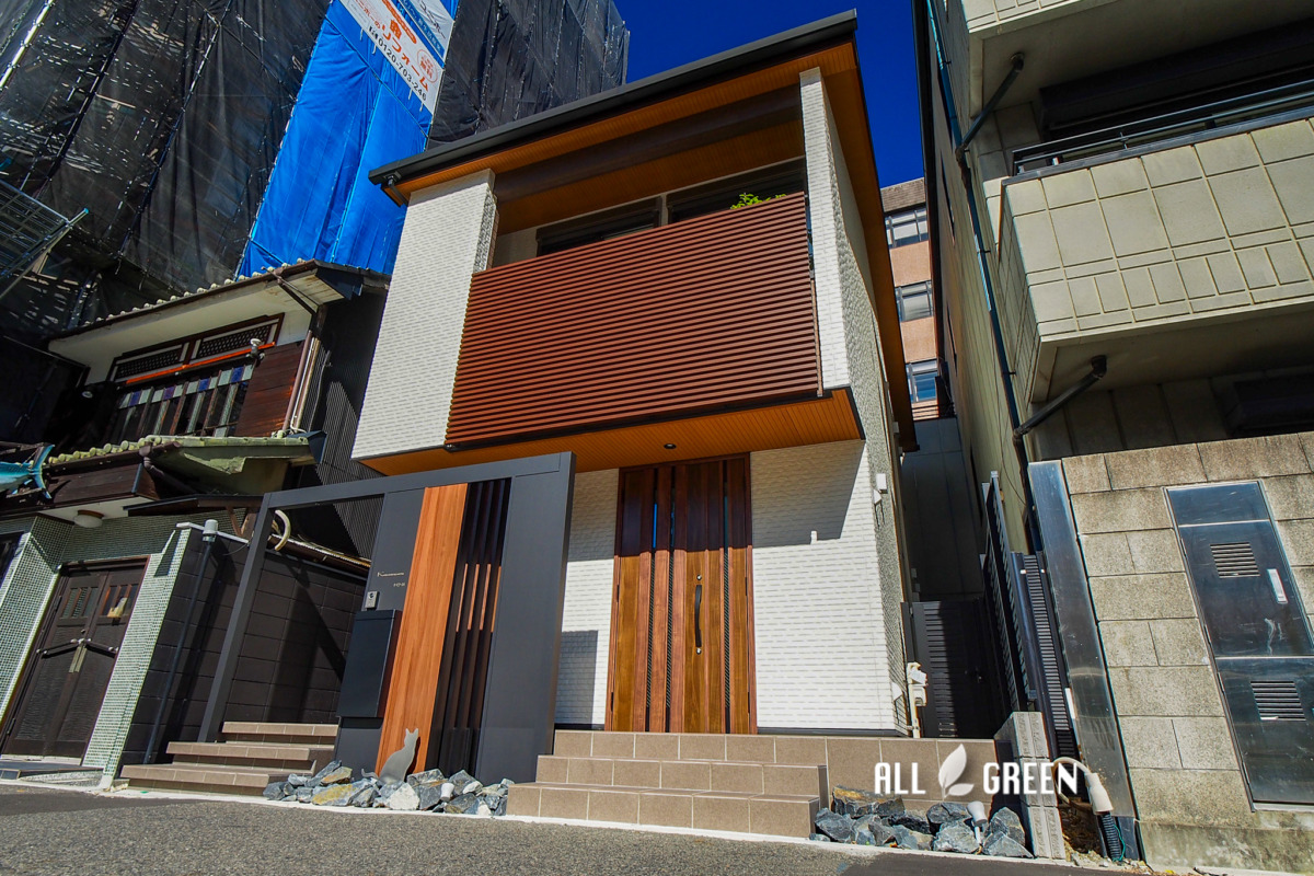 木調色がアクセントになってる邸宅にあわせて「木目調をアクセントにいれたモダンな雰囲気に仕上げたい」とのご要望を頂きましたので、ファサードは木目とブラックを使ったモダンでシックな雰囲気に仕上げました。