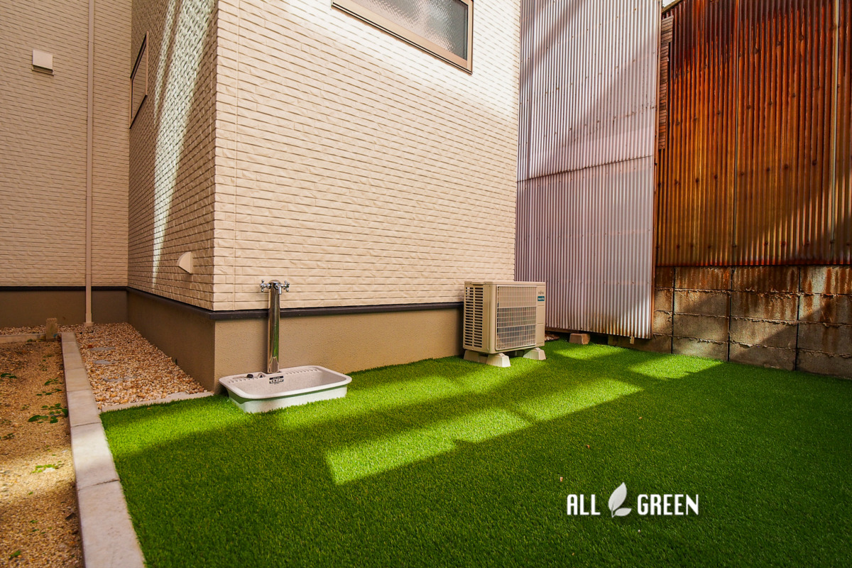 邸宅裏のお庭には、将来ワンちゃんを飼うときのために人工芝を施工しています。