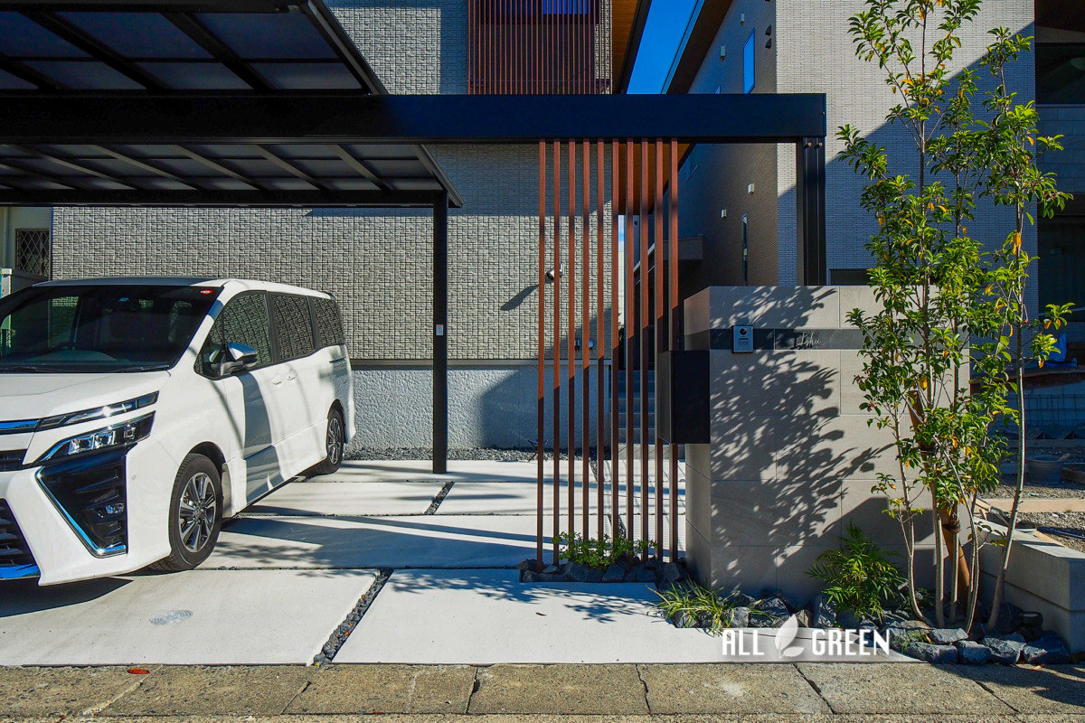 | 外構工事概要 | 愛知県長久手市I様邸新築外構 駐車場、カーポート、目隠し(縦格子)、ポーチ、門塀、ポスト、植栽 |