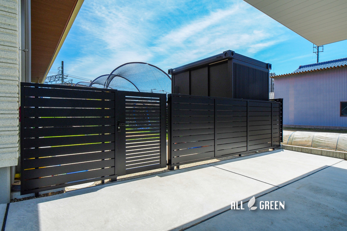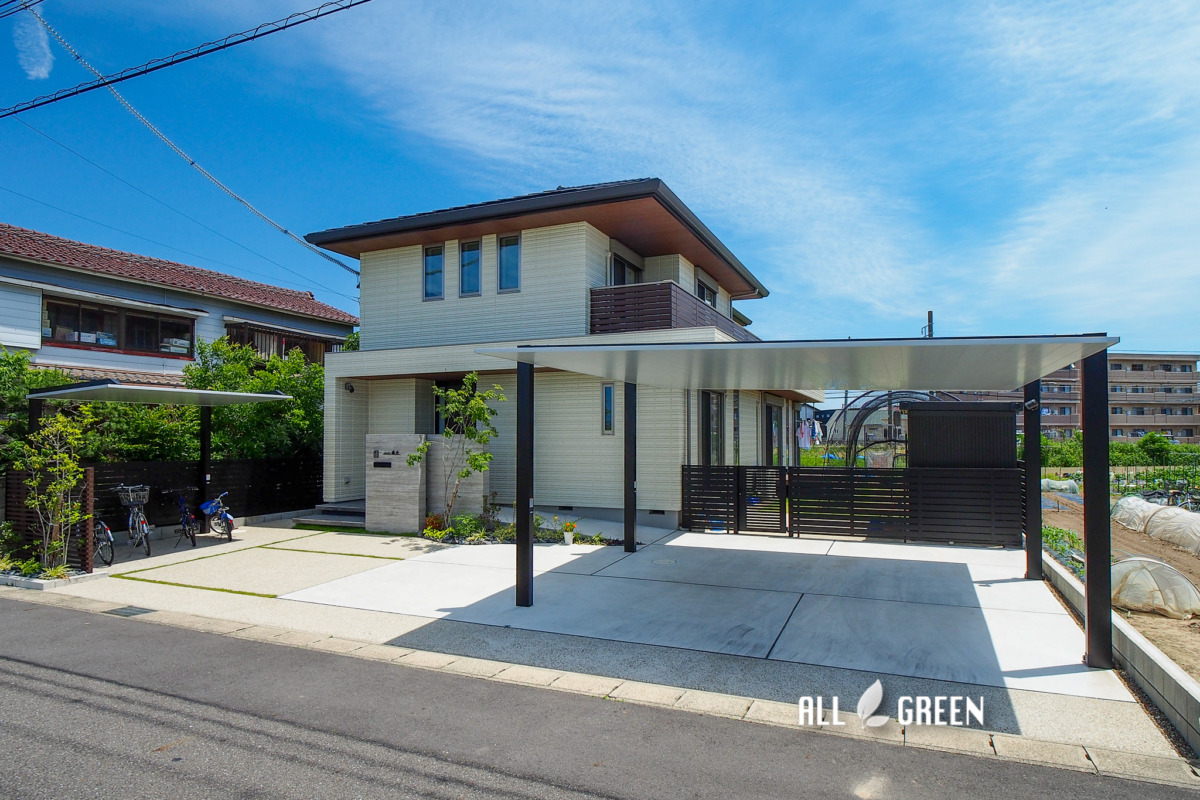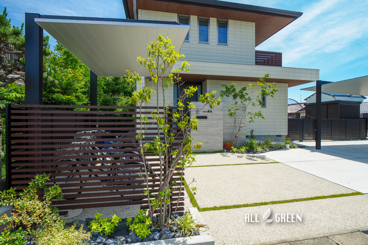 | 外構工事概要 | 愛知県一宮市F様邸新築外構 駐車場、カーポート、サイクルポート、アプローチ、門塀、玄関ポーチ、フェンス、門扉、照明、植栽 |