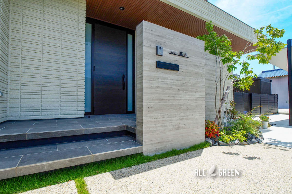 手前の塀は表札やインターホン、ポストを設置し、メインの門塀として利用できるようになっており、奥の塀はアクセントとしてはもちろん玄関ドアを開けたときに室内の様子が見えにくくなるようさりげない目隠しとしての効果も図っています。