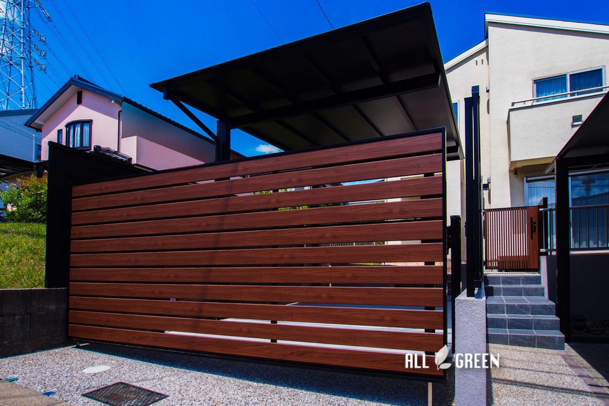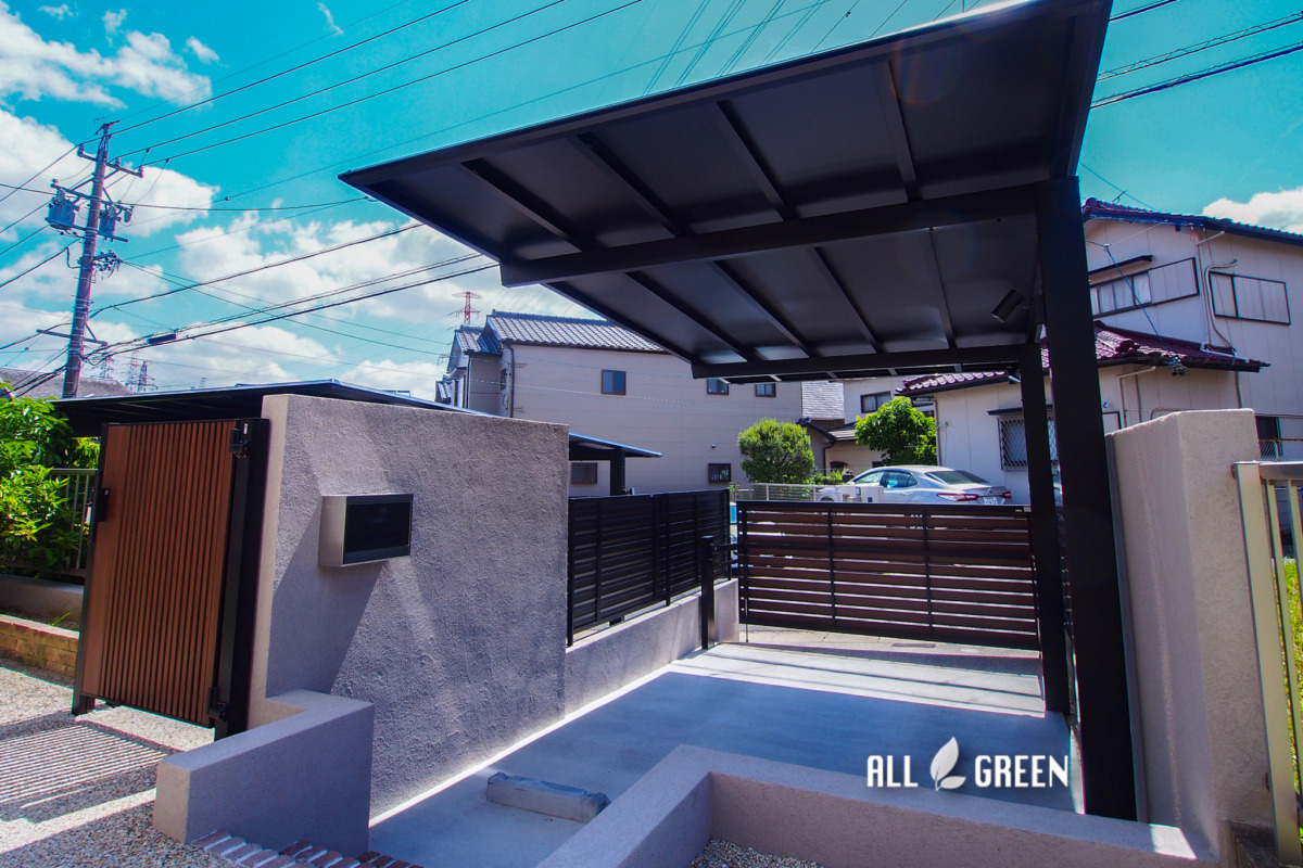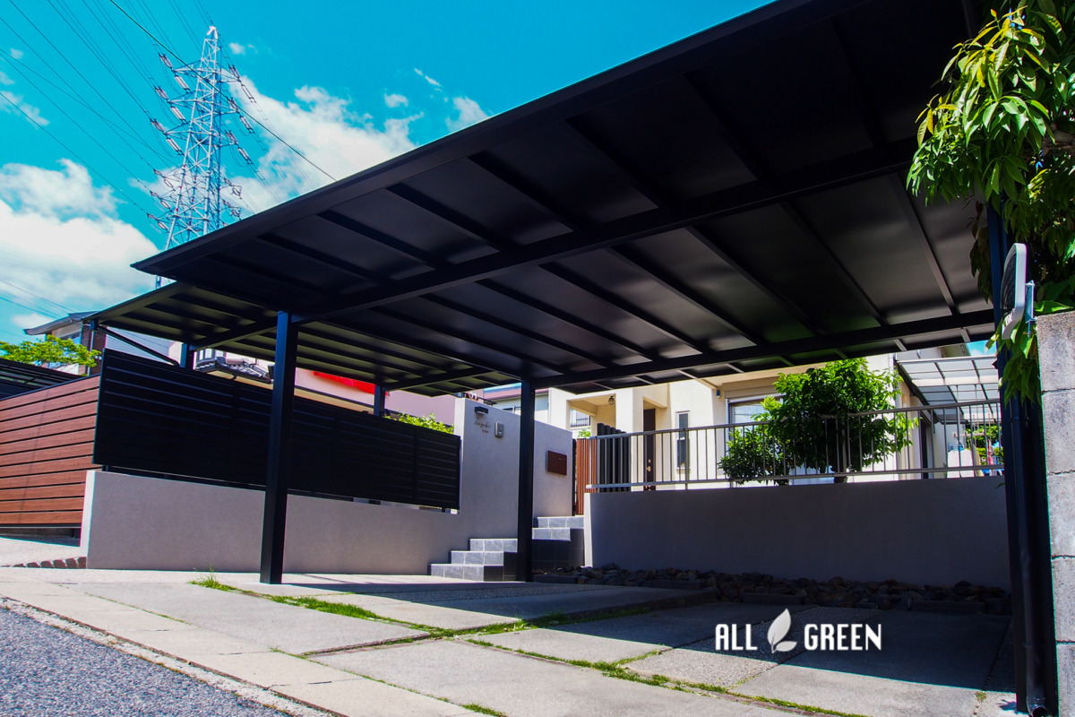 柱や梁、屋根部分すべてをブラックに統一することで、かっこいい駐車空間を演出致しました。