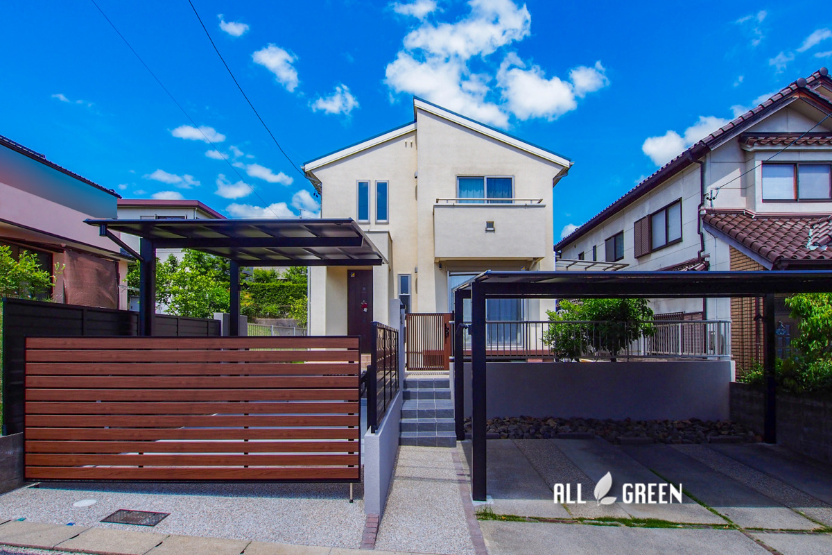 雰囲気ががらりとかわった大型リフォームではありますが、正面から見て右側の駐車スペースの床やその後ろの塀とフェンスなどリフォーム前の状態を活かした箇所もあるのがポイント!空間がうまくデザインされています!