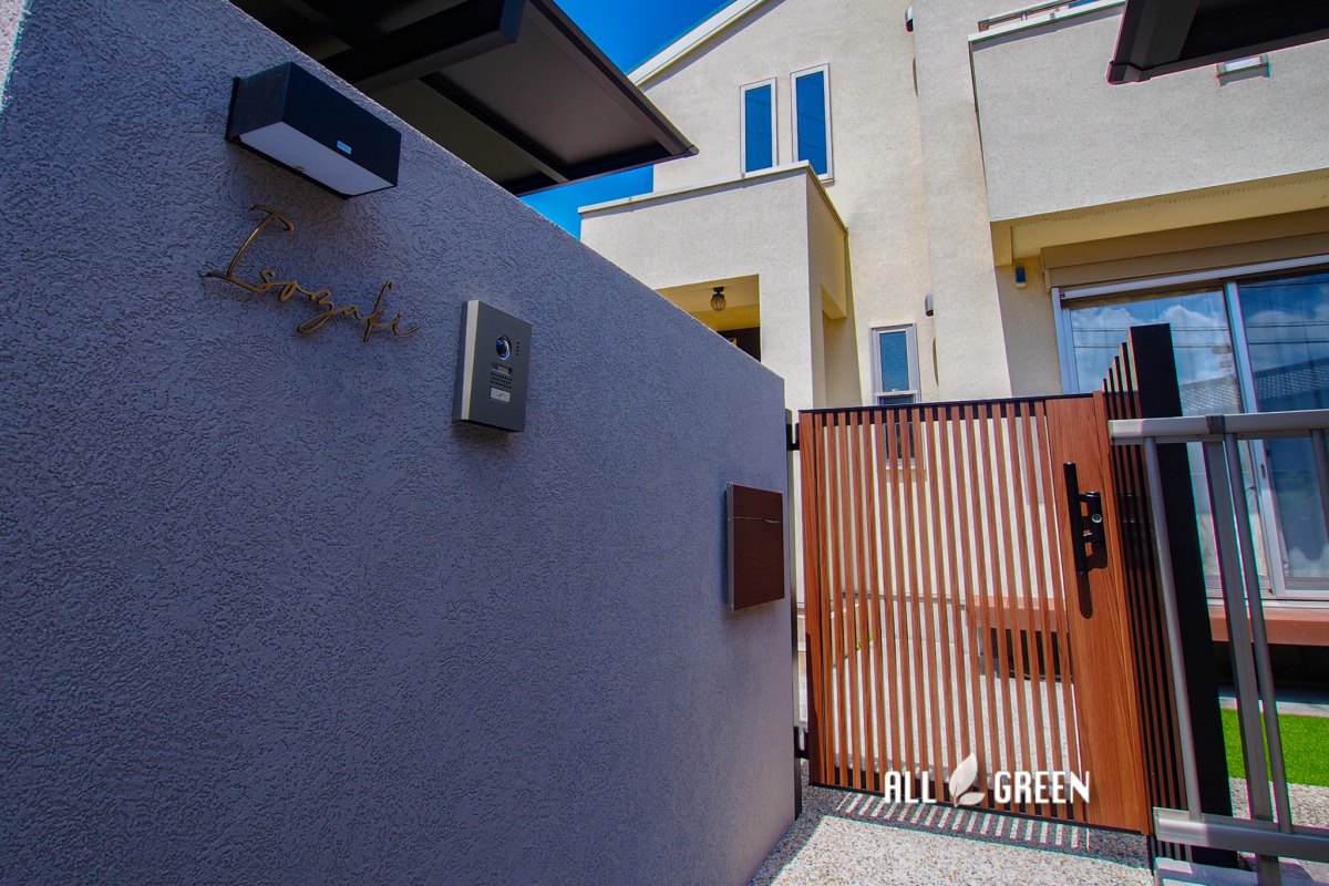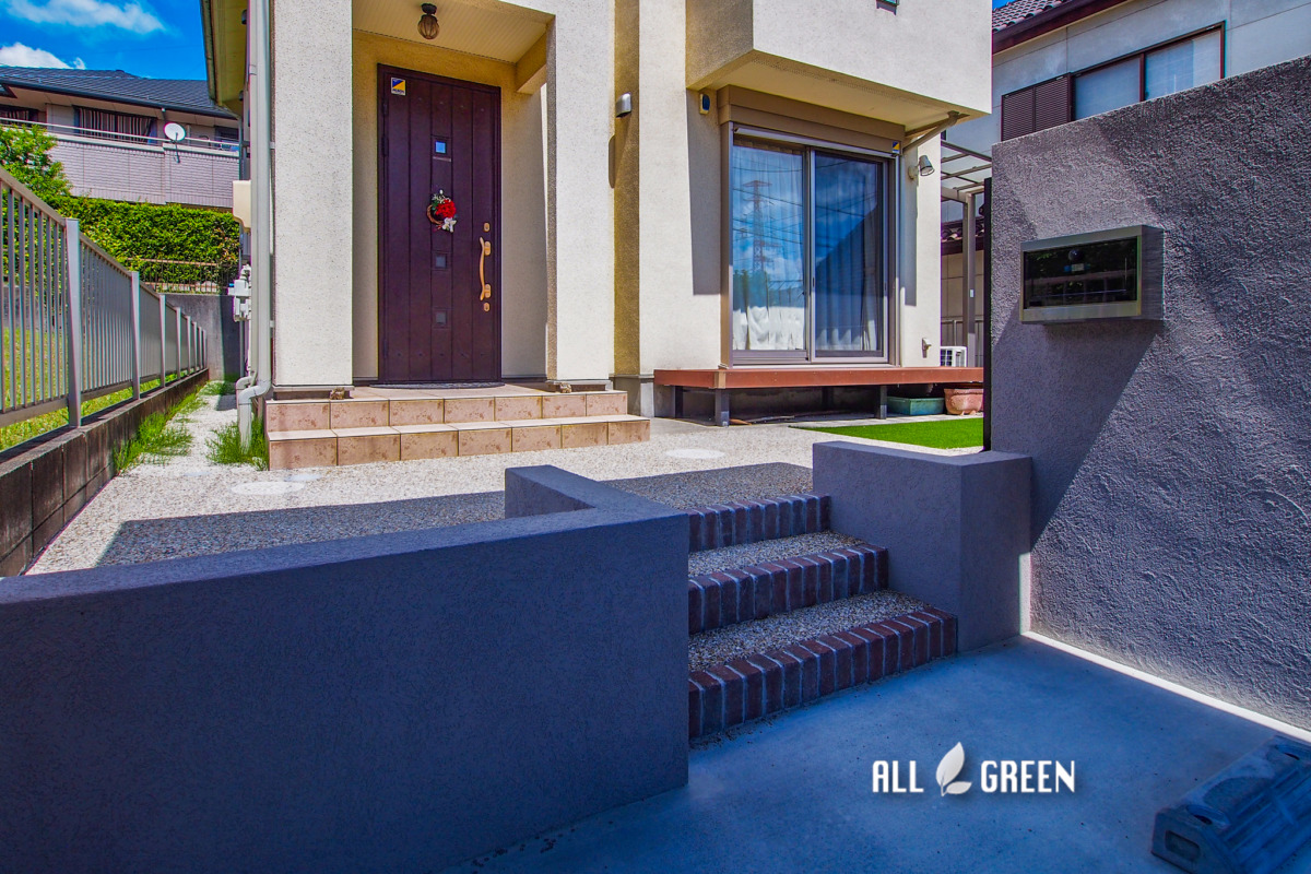駐車空間を区切る為の塀と門塀、2つを兼ねた壁がアプローチの階段横に施工されており、無駄のないスタイリッシュな門周りが完成しました。
