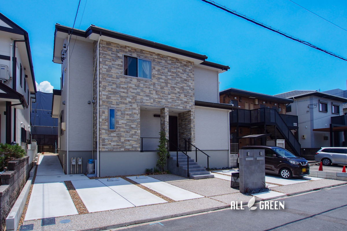 広くて開放的な外構が魅力的な邸宅ですが、スペースを広くとる為に2世帯分を1つの門塀にまとめたり、階段の手すりを側面に取り付けたり等スッキリとさせる工夫が施されています。