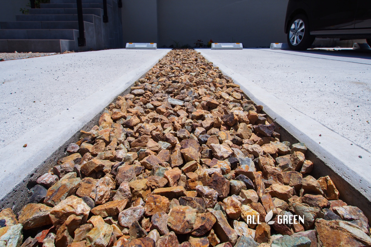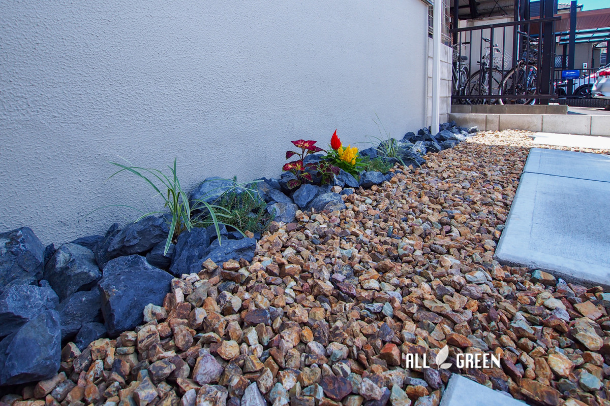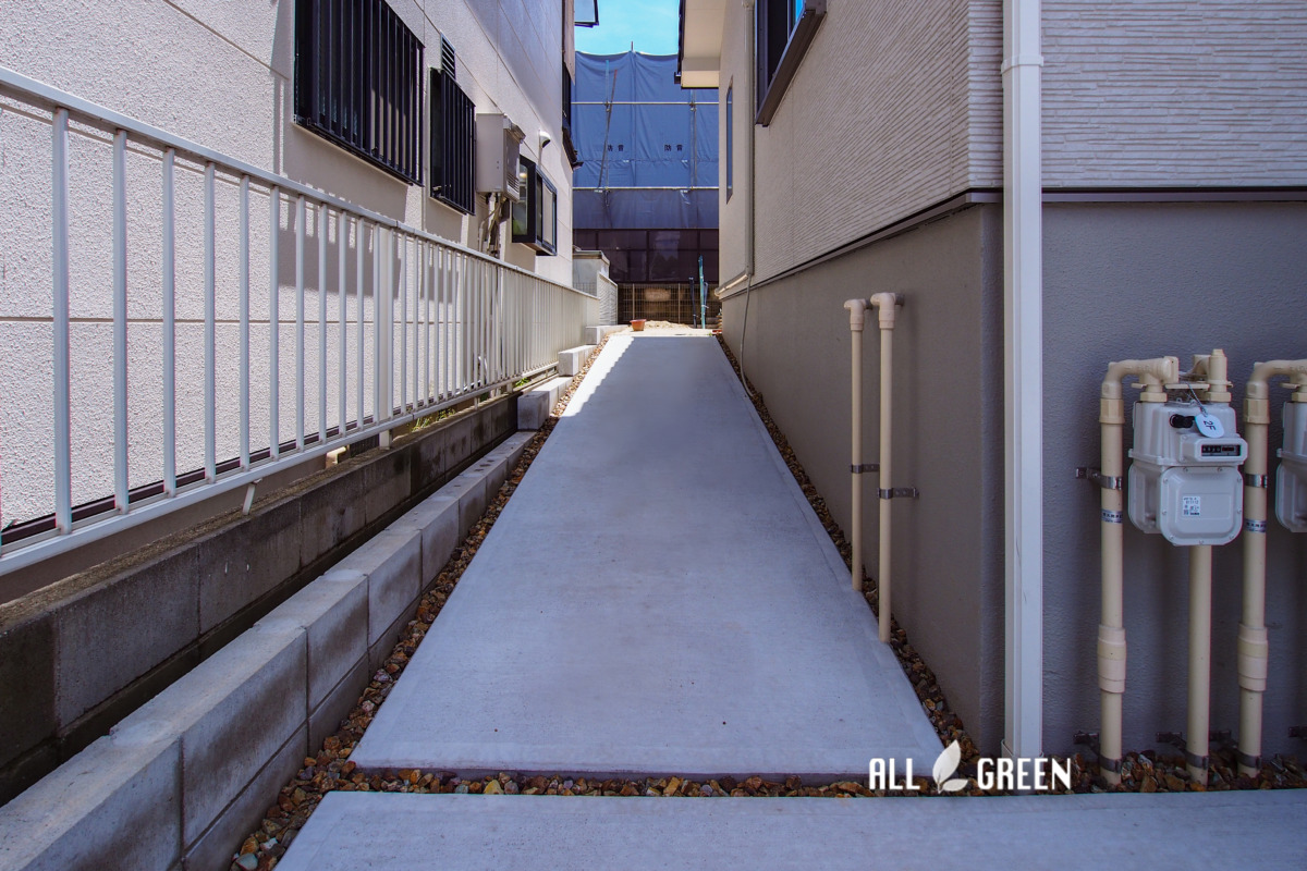 北側に面していて影になりやすい為、コンクリートの間には明るい印象を与えるチャート石を敷いています。