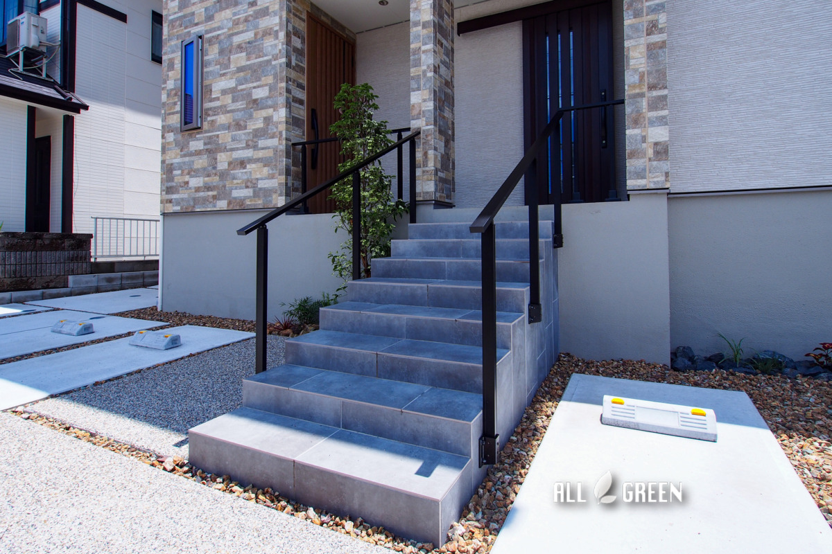 階段は門塀で使用したタイルと合わせ、統一感を図っています。