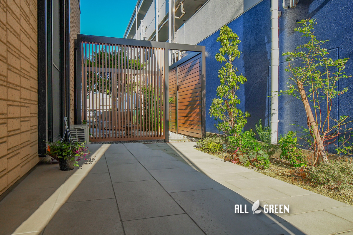 タイルデッキはEXALIVEのノルディックストーンというタイルを使用しています。素材の美しさを追求したデザインが特徴的なタイルです。吐き出し窓の前にタイルデッキを施工することで、お部屋からいつでも気軽にお庭へ出られるようになっています。そして、窓から見える位置に植栽を配置することでお部屋の中からでも自然を感じられる空間に。