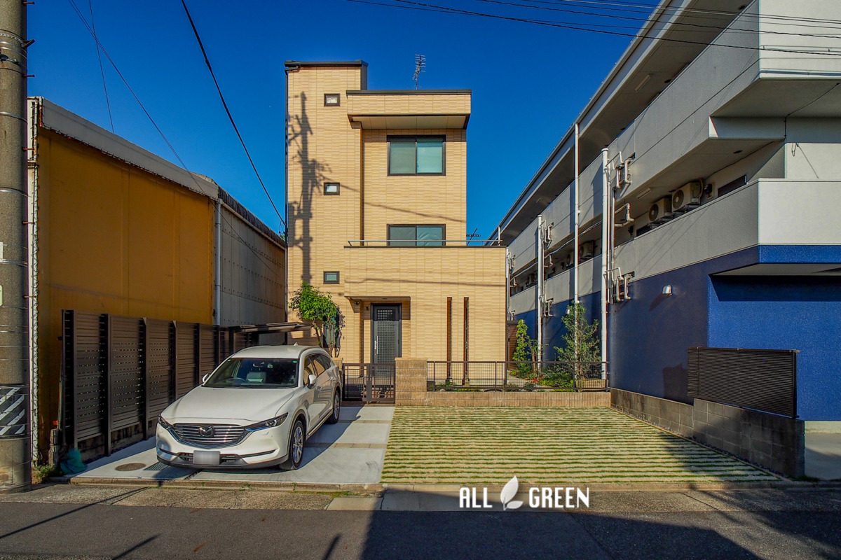 舗装と芝を組み合わせてデザインすることで、シンプルで落ち着いた雰囲気の中に鮮やかな緑が映え、自然を感じられる駐車空間へと生まれ変わりました。