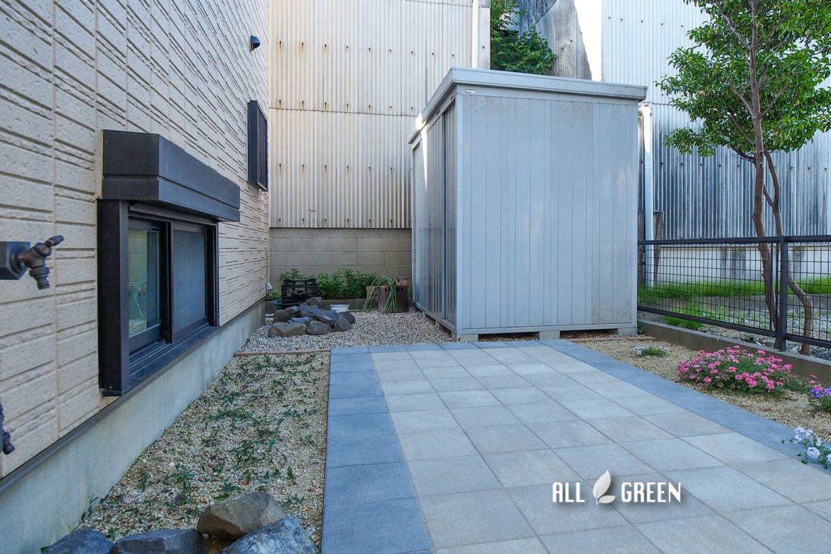 物置を施工することでBBQ用品を収納でき、いつでもすぐに取り出してセッティングできる快適なお庭に仕上がりました。