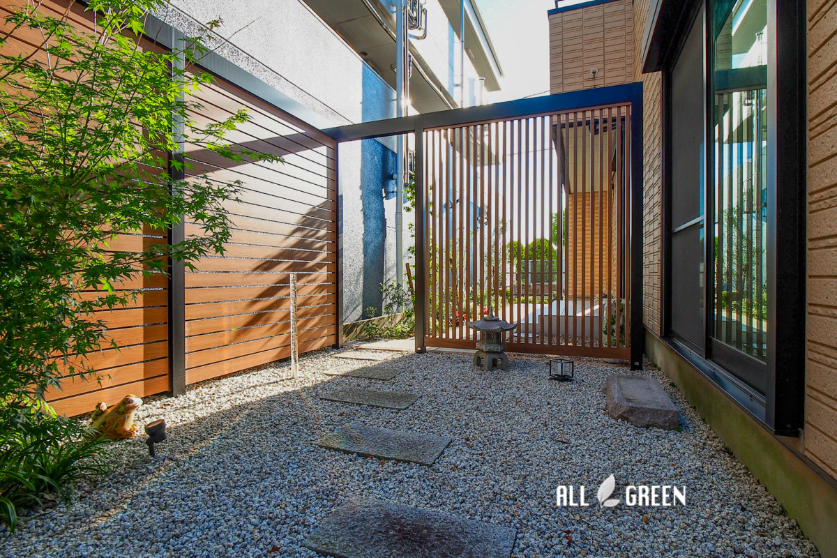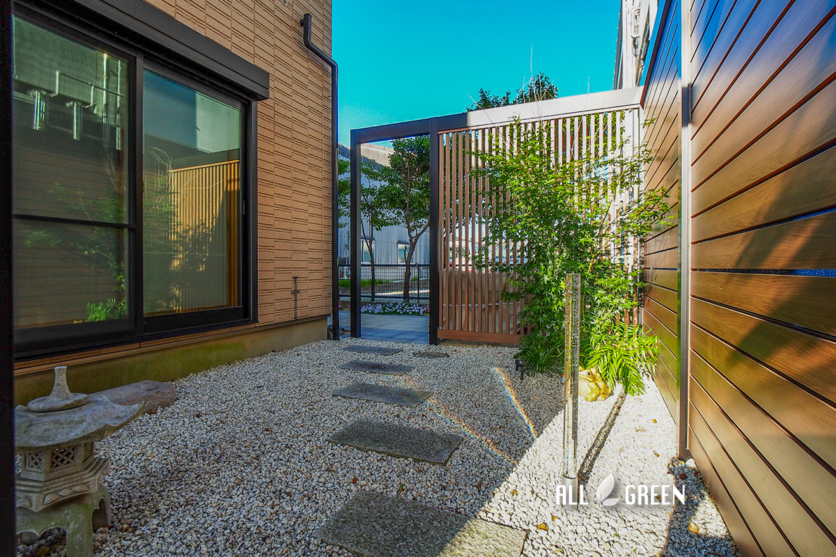 お庭部分は、中央にプラスG「Gスクリーン」を施工し和室前と洋室前でそれぞれ違う雰囲気のお庭になるようにデザインしています。木調のスクリーンで囲まれた和室前のお庭部分は、明るくて上品な雰囲気が特徴的な白川砂利を敷き、和の雰囲気を演出しました。スクリーン前にはガラスのポール照明を設置。昼は太陽の光でキラキラ輝き、夜になると明るすぎない繊細な光で周りを優しく包み込んでくれます。