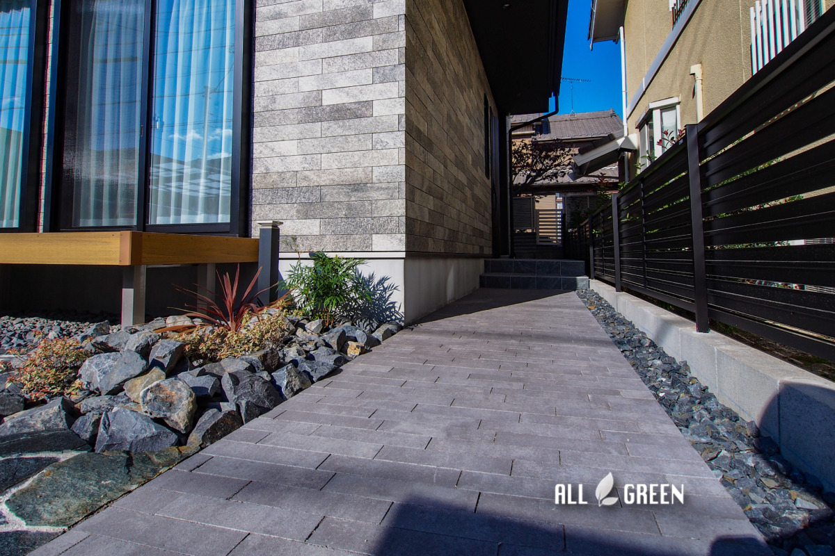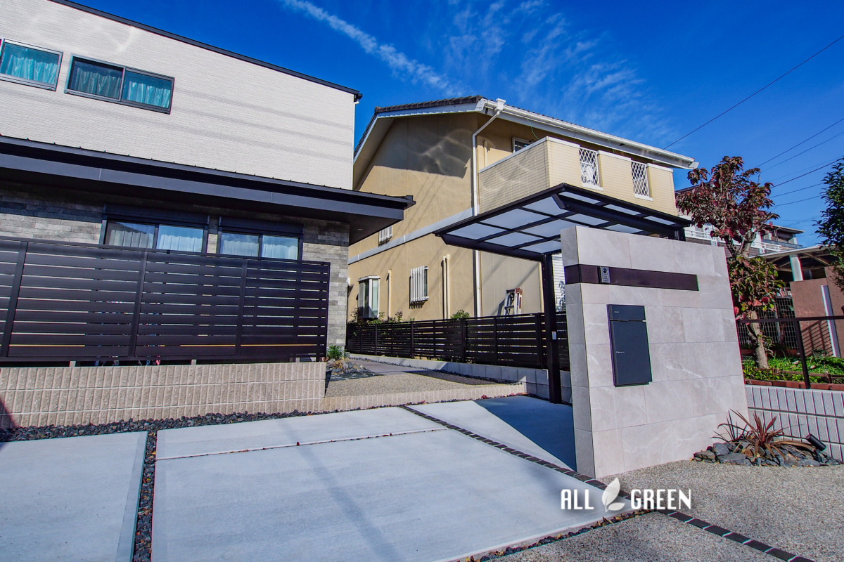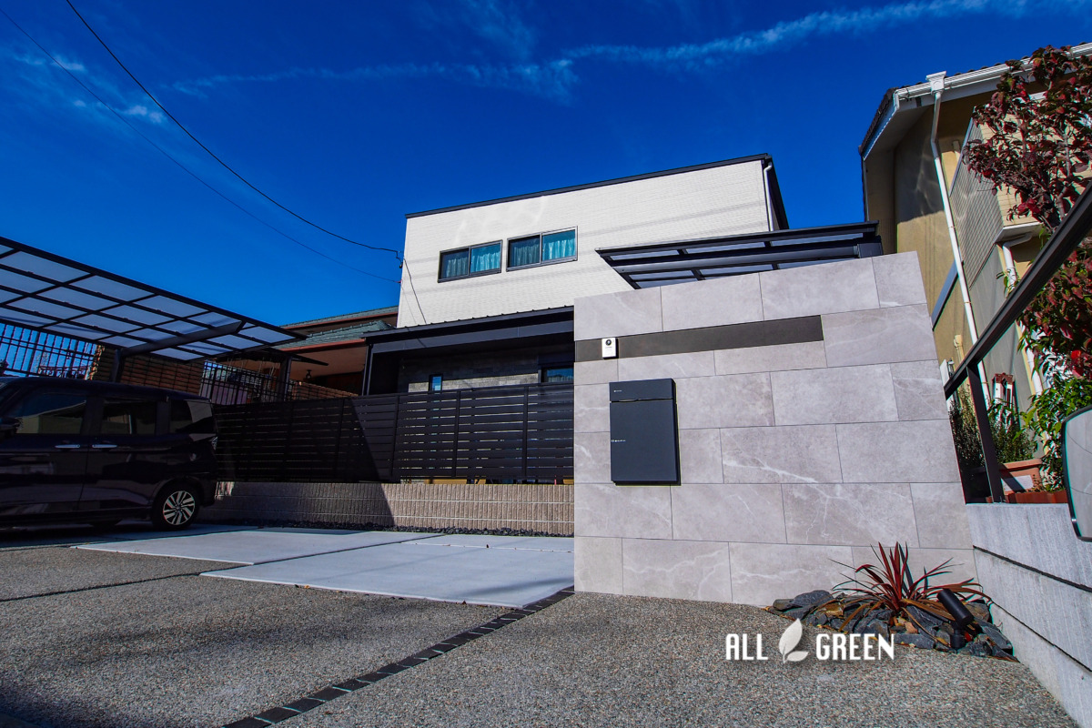 雨の日でも快適に生活できる空間が実現し、機能性とデザイン性を兼ね備えた門周りに仕上がりました。