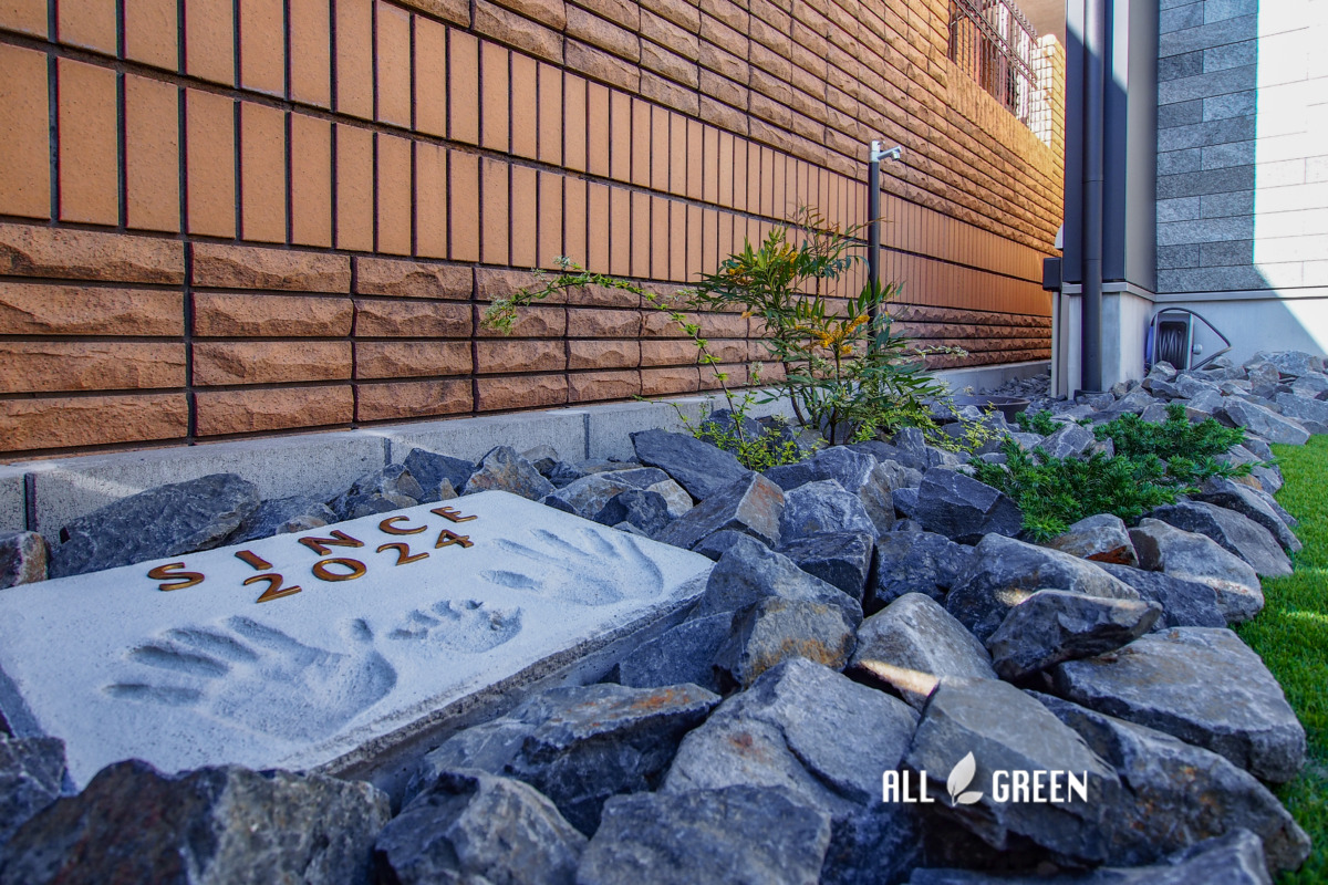 お庭の奥には、ご家族の手形アートが刻まれています。大切な思い出が形となり、ご家族の「今」を記録する特別な空間となりました。