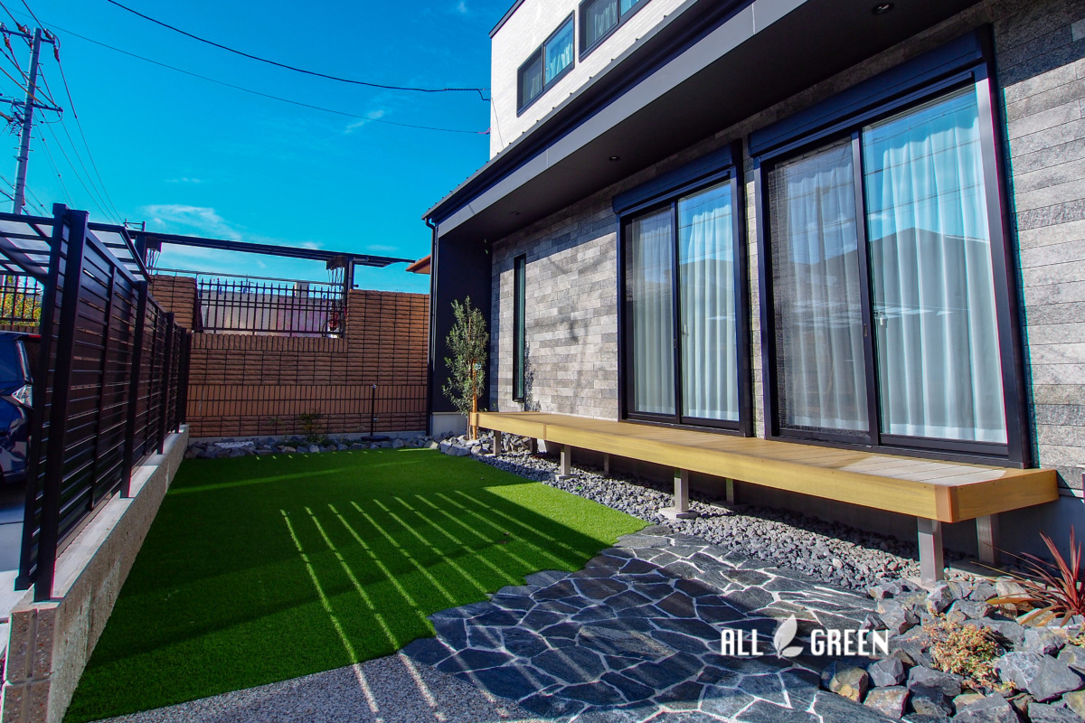 掃き出し窓の前に設置された人工木デッキは、いつでも気軽にお庭へ出られる魅力的なポイントです♪さらに、人工芝を敷いたことで、一年中緑を感じながら、ゆったりとおくつろぎいただける空間に仕上がりました!!