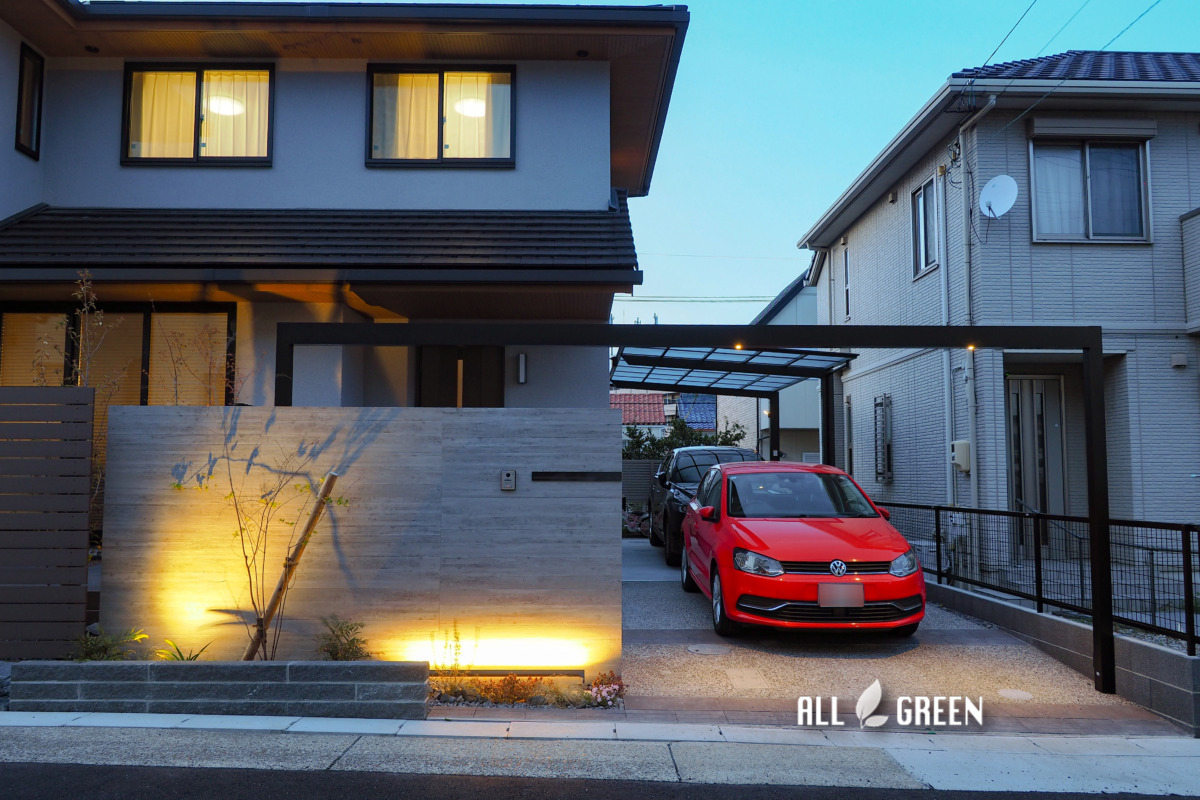 | 外構工事概要 | 名古屋市緑区 K様邸新築外構工事 駐車場、カーポート、照明、お庭、植栽、フェンス、門塀、 |