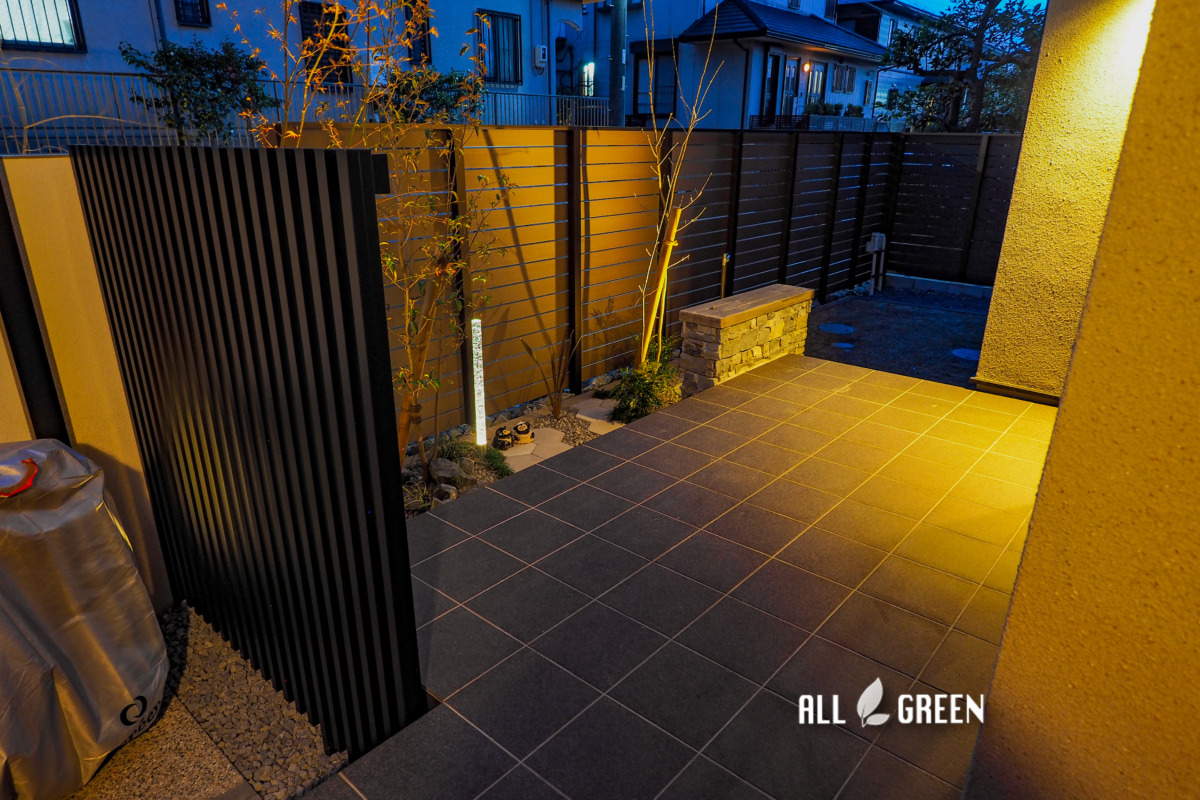 お庭は天然芝と植栽を取り入れ、四季の移ろいを感じられる豊かな空間に仕上がりました。自然ならではの美しい緑と季節ごとに変化する風景を楽しめることが大きな魅力です。アオダモやヤマボウシをバランスよく配置することで、お庭にいながら自然を身近に感じられるようになりました。また、背の高い木々は目隠しとしての役割も果たし、プライバシーを守ってくれます。さらに、緑には心を落ち着かせるリラックス効果もあり、日々の暮らしに安らぎを与えてくれます。掃きだし窓前に設置されたタイルテラスでは、のんびりとくつろぎながら自然の風や緑を感じる贅沢な時間を過ごせる空間に。照明はEXALIVEの”一条の光”というガラスポール照明を採用。昼間は太陽の光でキラキラと輝き、夜になると繊細な光のラインが植栽や空間を照らしてくれます。昼とは違う幻想的な雰囲気を楽しめる、癒しのお庭が完成しました。