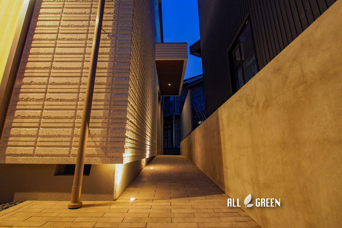 門塀には、EXALIVEの「ノルディックストーン」というタイルを使用しました。全6色のカラー展開の中から、採用したグレー系の「ノルヴェジア」が織りなす上品なグレートーンと、天然石の風合いを再現した繊細なテクスチャーが、ラグジュアリーな雰囲気を演出し、洗練された佇まいの邸宅と調和しています。隣地境界部分に設けたことで、デザイン性だけではなく協会の目印やプライバシーの保護としても役立つ仕上がりとなった門塀と建物正面には照明を設置。夜になると優しい灯が空間を包みこみ、昼間とは異なる幻想的な雰囲気に。また、邸宅全体が明るくなることで、不審者が近づきにくくなったり防犯対策につながったりと、安心してお過ごしいただけるファサードに仕上がりました。