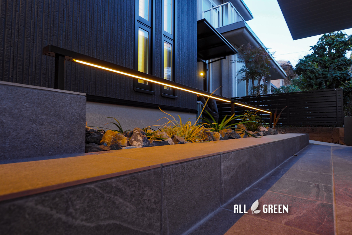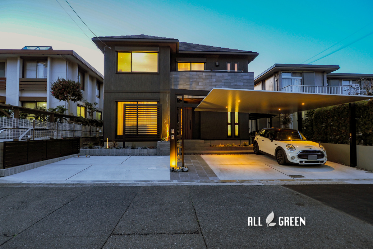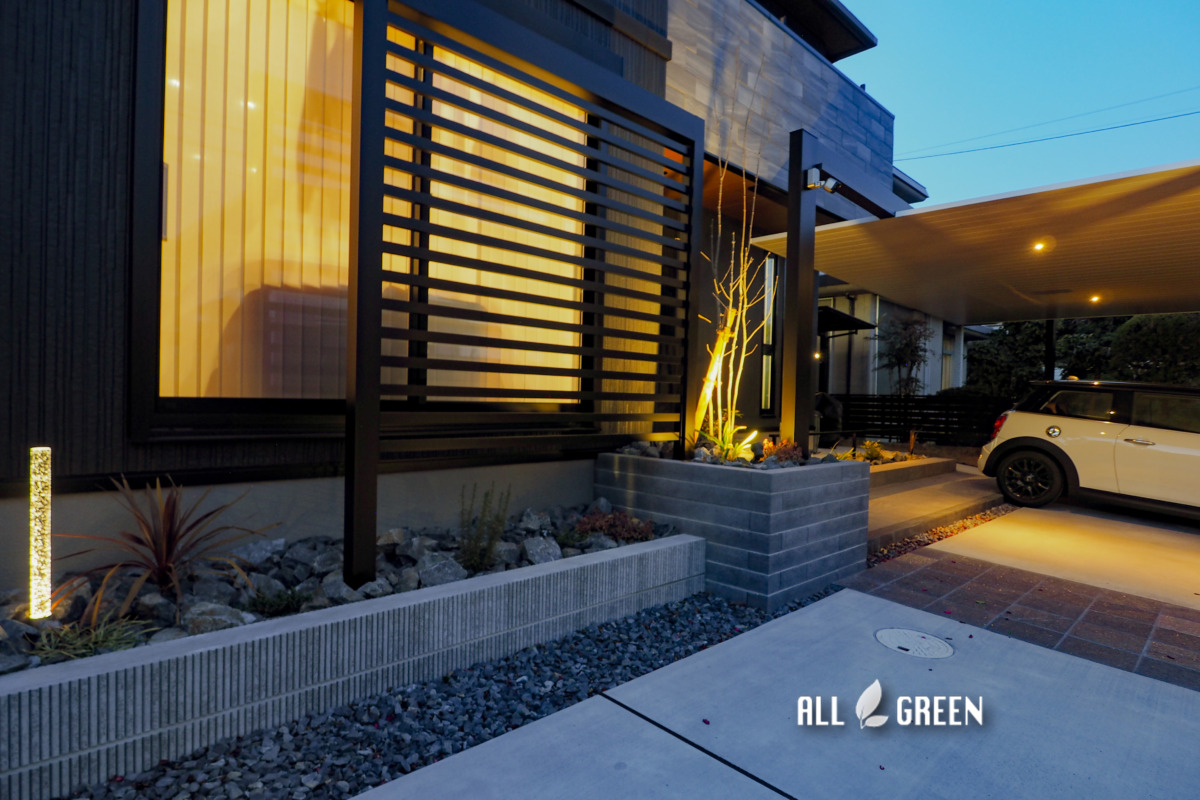 外構の要所要所に照明を設置することで、昼は上品で落ち着いた印象、夜は幻想的な雰囲気をお楽しみいただける、機能性とデザイン性を兼ね備えた外構が完成しました。