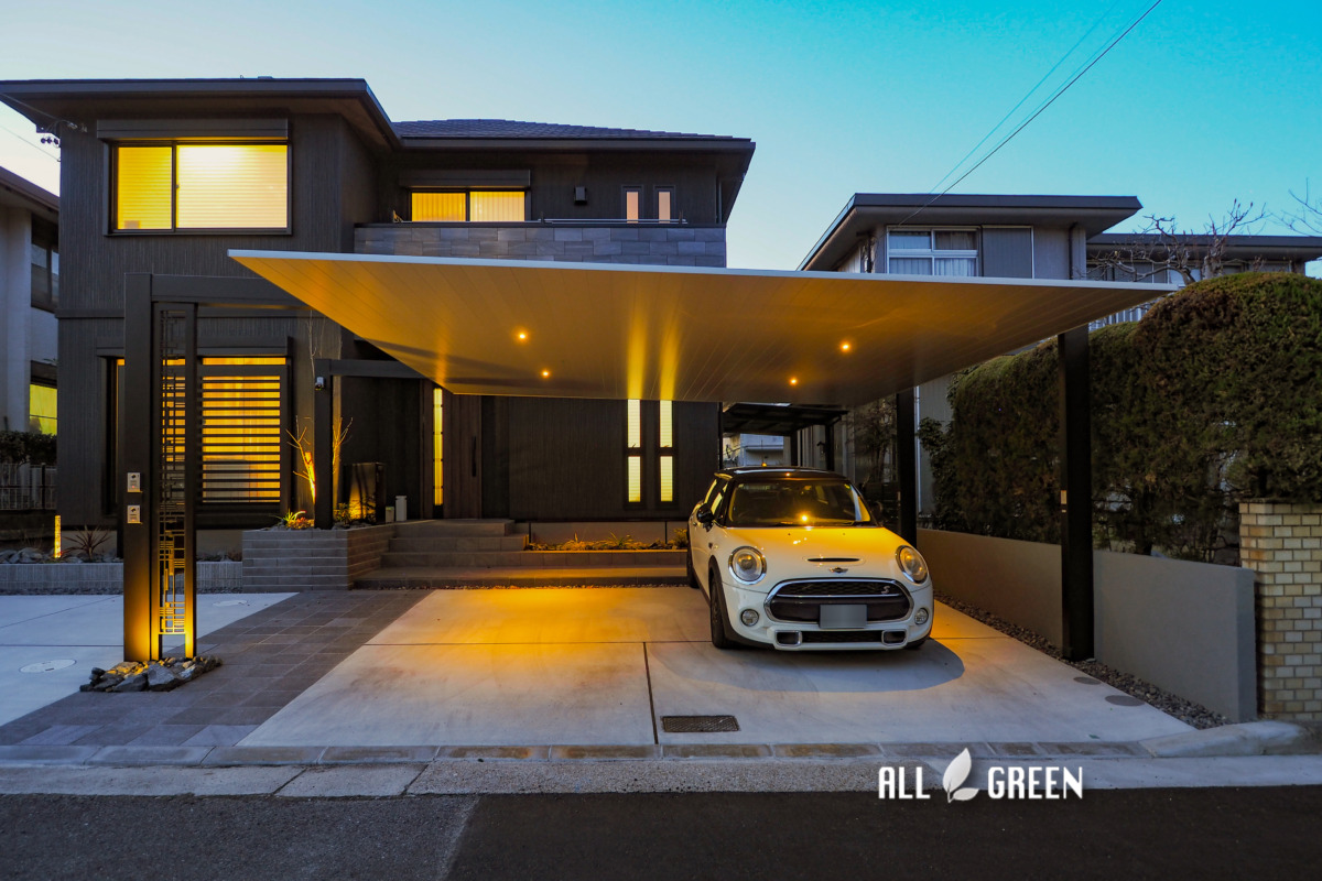 シックな雰囲気が魅力的な邸宅の新築外構工事をお任せいただきました。広々とした駐車場には2台用のカーポートを設置し、残りのスペースには車止めブロックを配置することで、急な来客にも対応できるゆとりのある設計になっています。カーポートにはスマートなフォルムが魅力的なLIXILの「カーポートSC」を採用。豊富なカラーバリエーションとオプションにより住まいの外観や使い方に合わせたカスタマイズができる点も魅力のひとつです。今回は屋根に、光沢を抑えたマットな質感が特徴の「ナチュラルシルバーF」、柱に「ブラック」を選択し、すっきりとしたフォルムで邸宅になじみつつ、スタイリッシュな印象を与えるデザインに仕上げました。さらに、梁を延長することで、ファサードゲートのような存在感が生まれ、開放的でダイナミックなエントランスとなりました。カーポートの天井に設置したダウンライトが夜になると眩しすぎない柔らかな光で空間を包み込み、駐車場全体を明るく照らしてくれるため、夜でも安心して車の出し入れができます。また、柱にEXALIVEの「midorinoranma」というパネルを組み合わせることで、個性あふれるデザインに。柱の足元には割栗石を配置し、無骨さの中にも洗練された印象をプラスしています。
