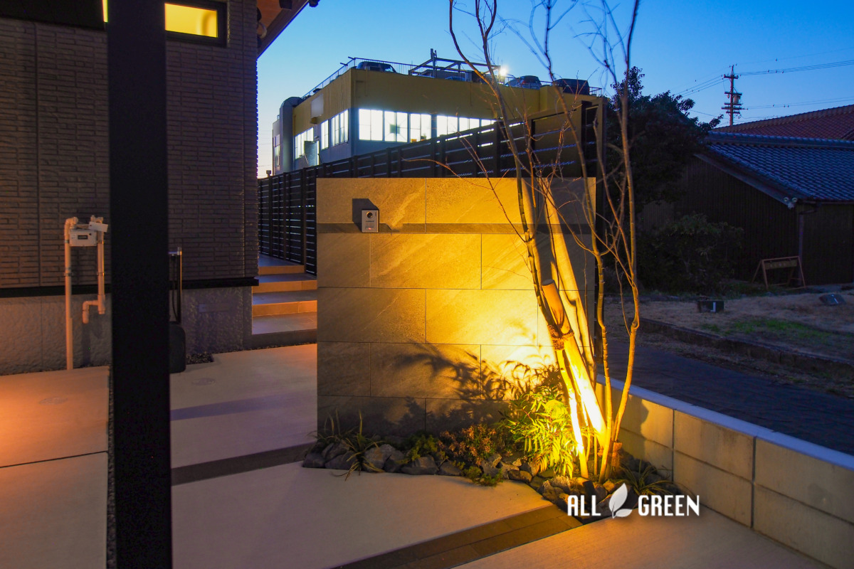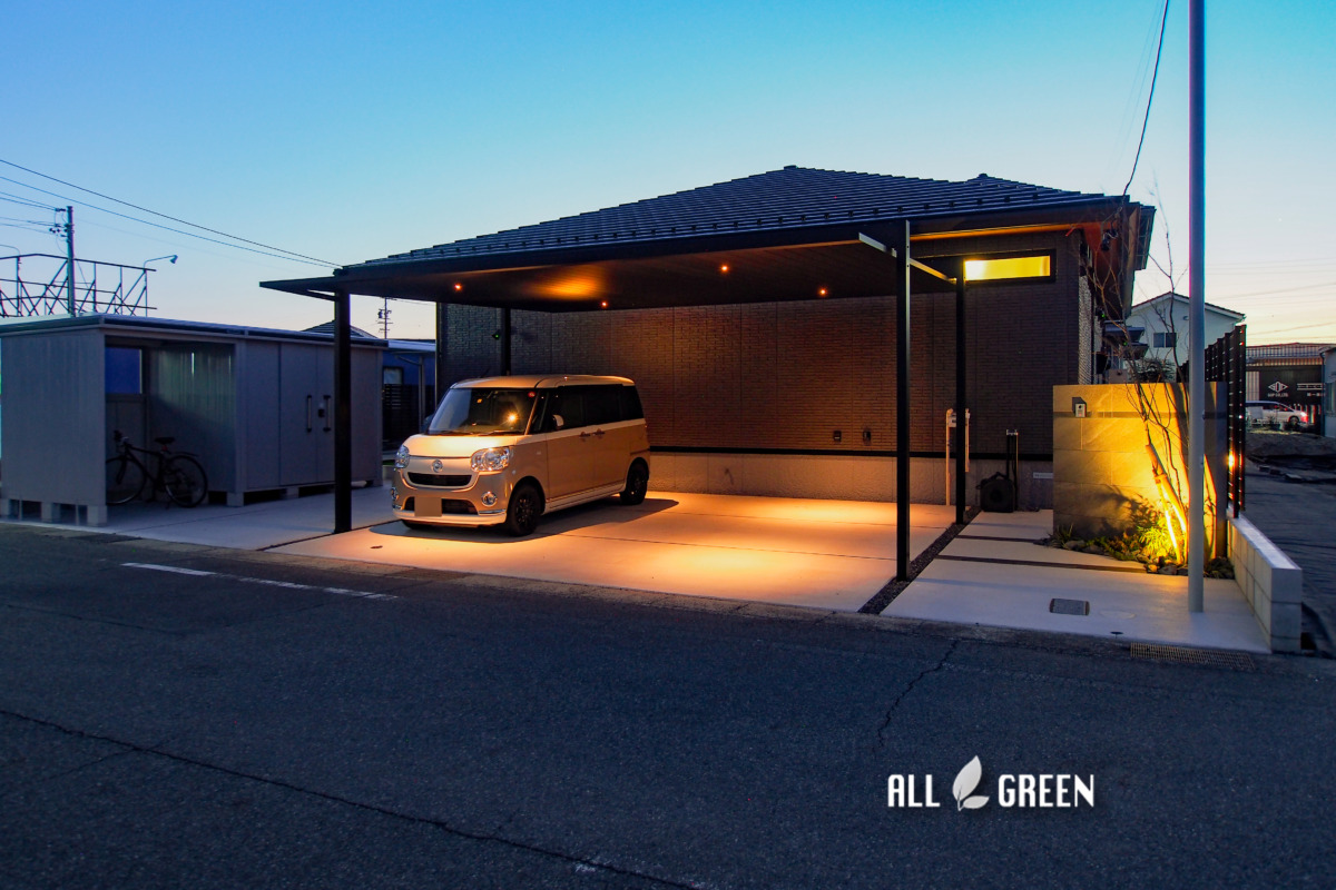 また、カーポートの天井や植栽スペースには設置した照明が、夜になると幻想的に空間を包み込み、昼間とはまた違った魅力を楽しめます。照明によって車の出し入れがしやすくなるだけでなく、防犯面でも安心感があり、不審者の侵入を抑える効果も期待できます。夜間も快適で安全に過ごせるファサードに仕上がりました。